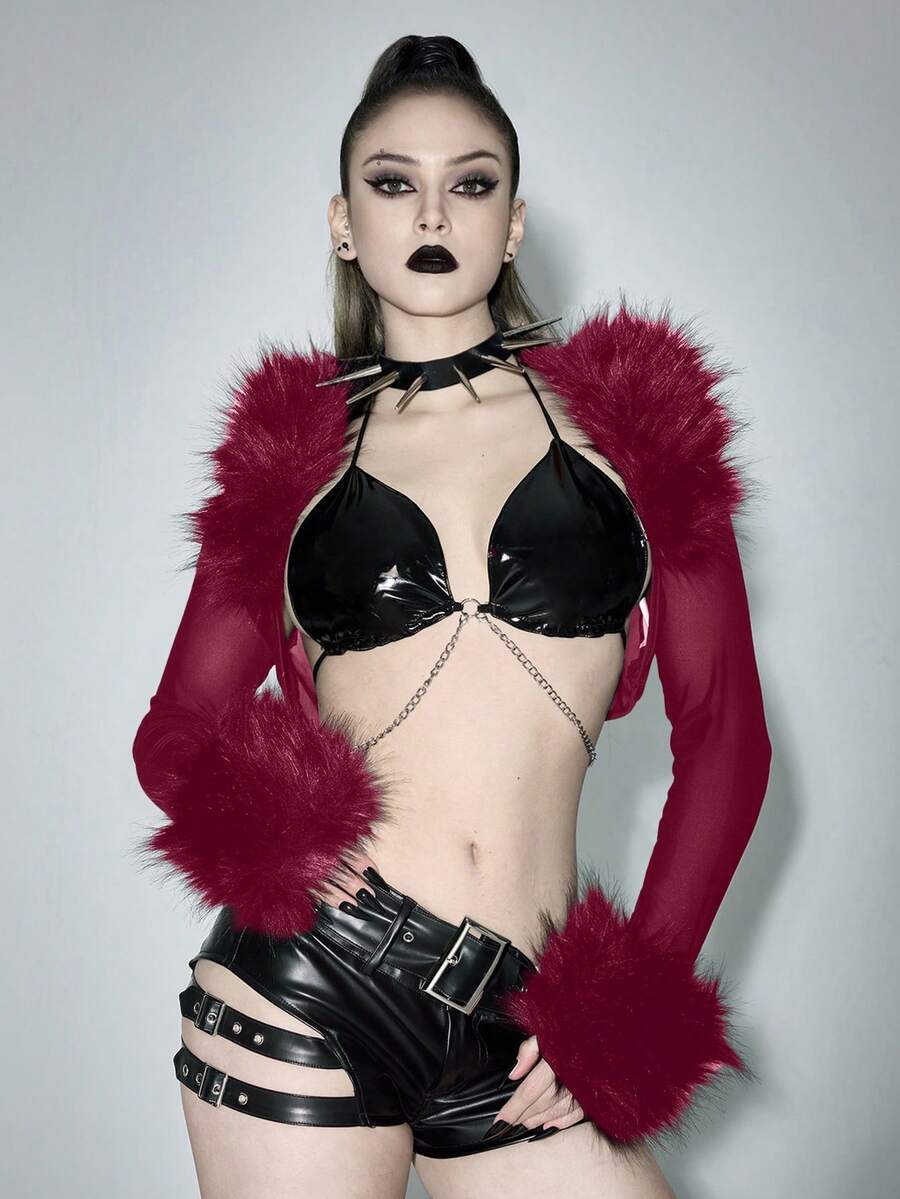 Grunge Punk Cardigan court style patchwork en maille noire avec col en fourrure, style Harajuku Y2K pour femmes. Peut être porté avec un débardeur ou une robe.