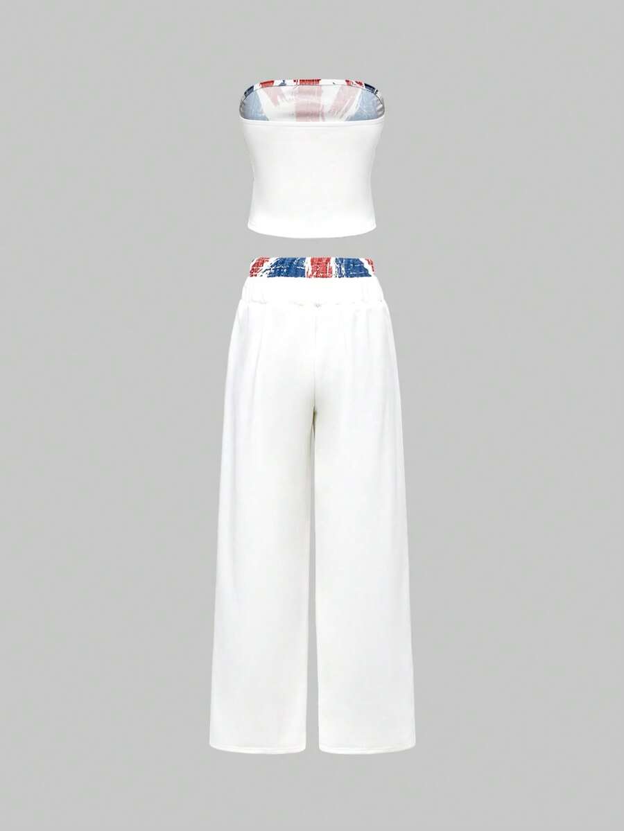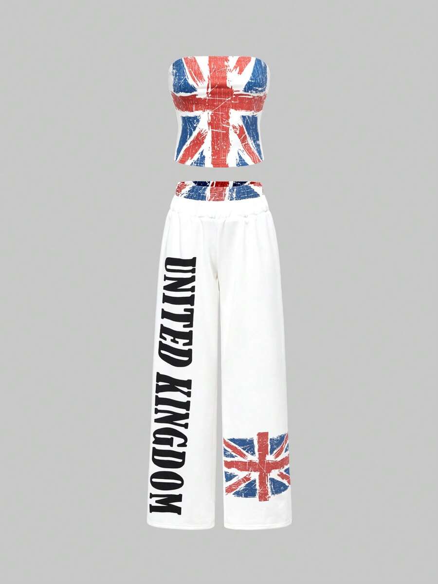 Grunge Punk 2 pièces/Set Femme Drapeau Britannique Taille Lâche Cordon de Serrage Top Court et Pantalon Jambe Large