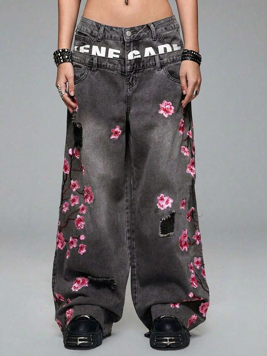 Grunge Punk Jeans ample femme avec design de double ceinture et broderie de fleurs de cerisier chic streetwear