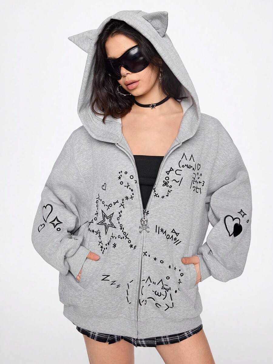 Grunge Punk sweat-shirt à capuche ample style de rue underground avec oreilles de chat brodées et émoticons, ouverture devant