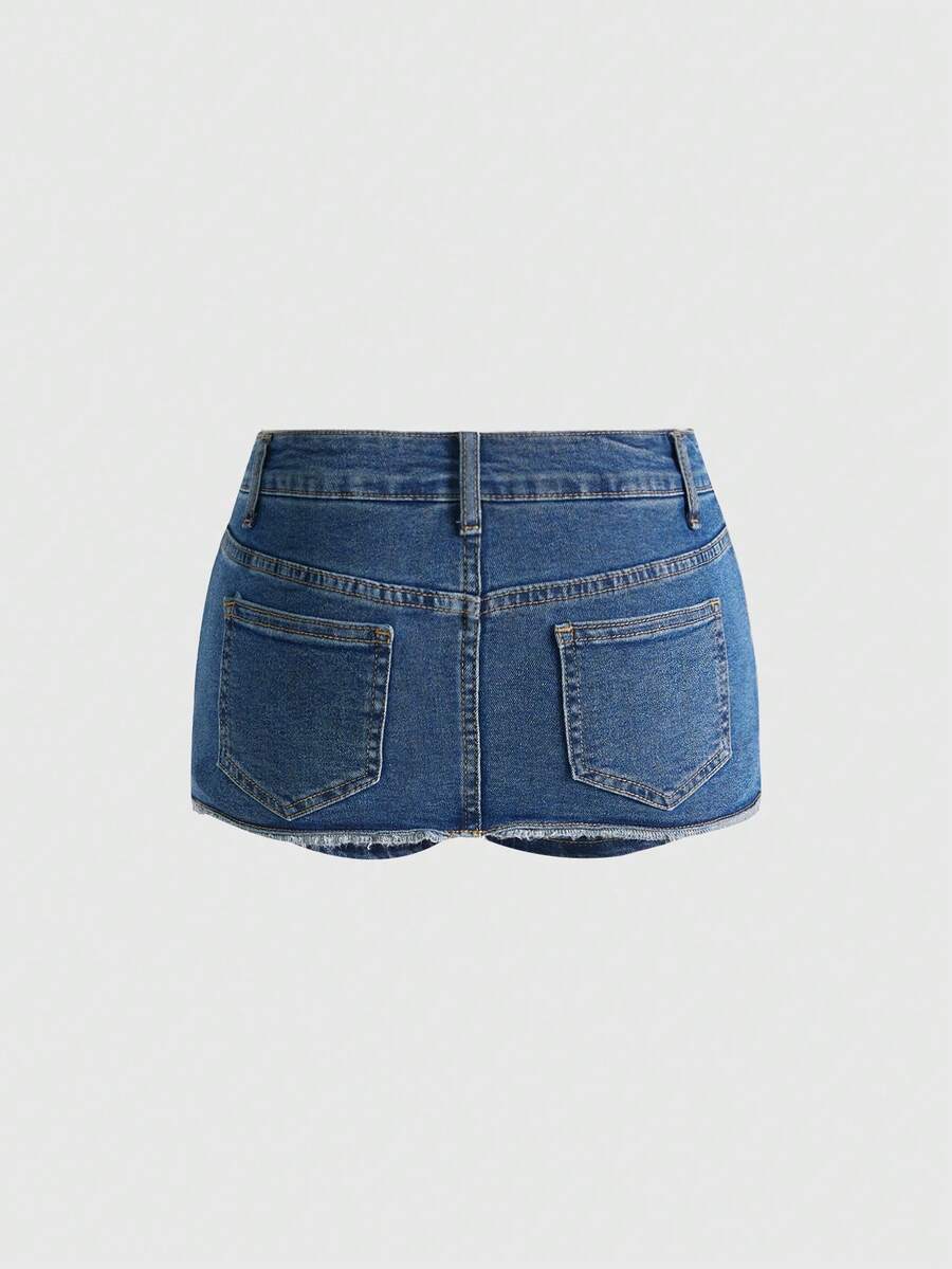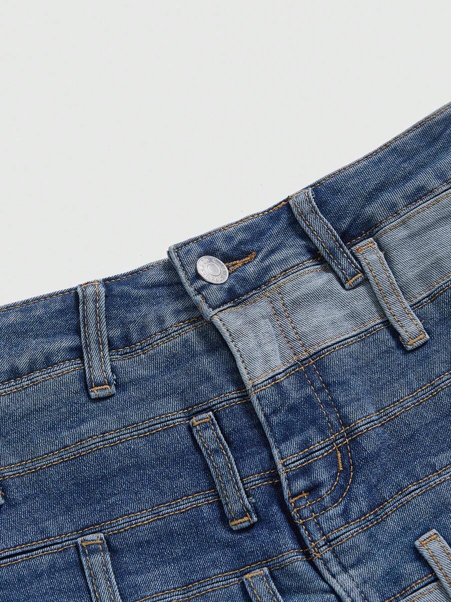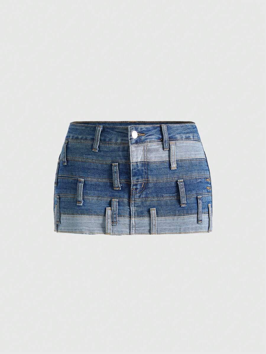 Grunge Punk Jupe en jean mini élastique à la taille, style streetwear casual avec patchwork de couleurs contrastées pour femmes