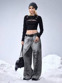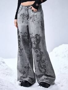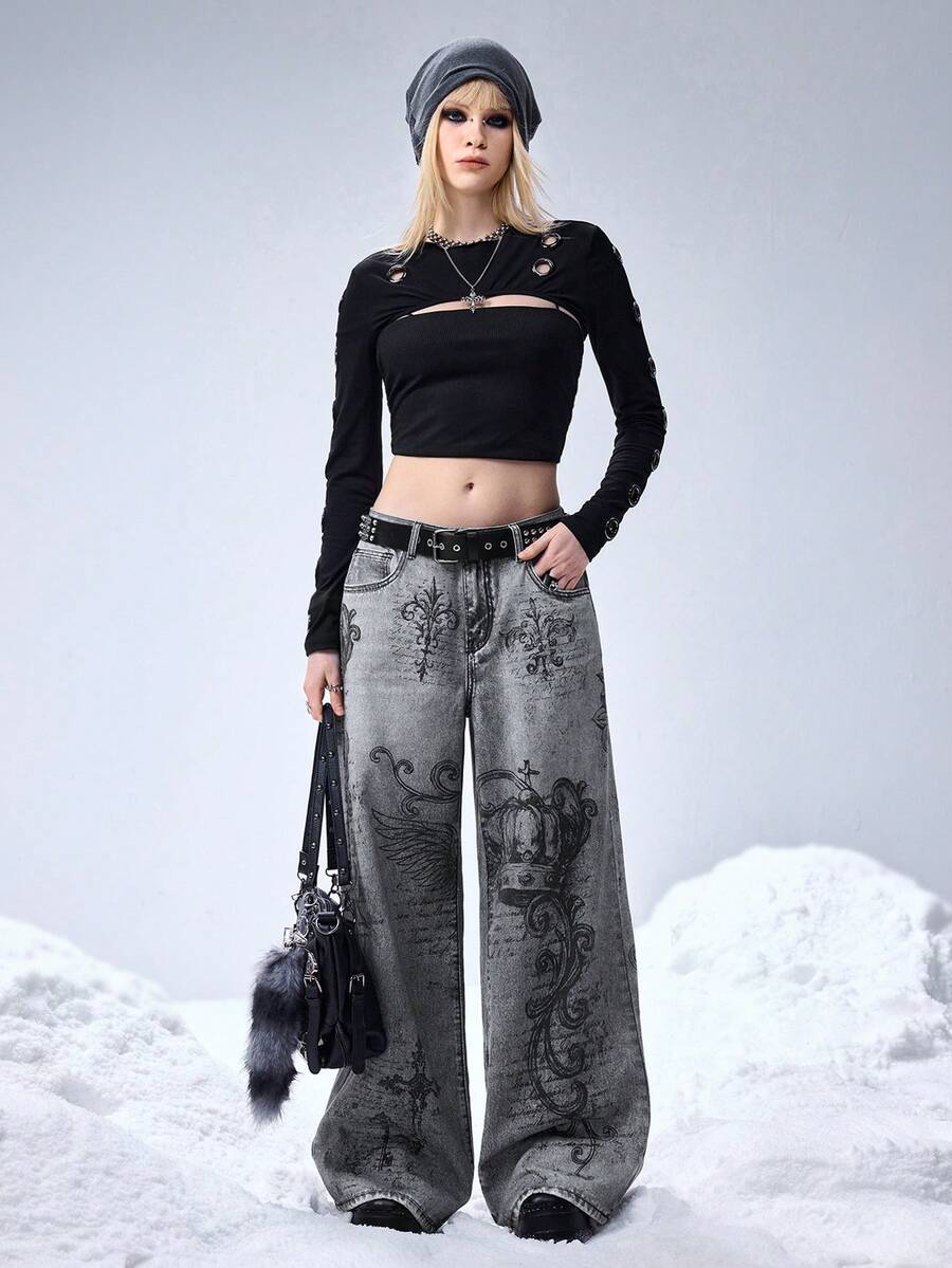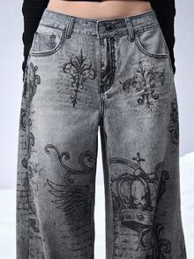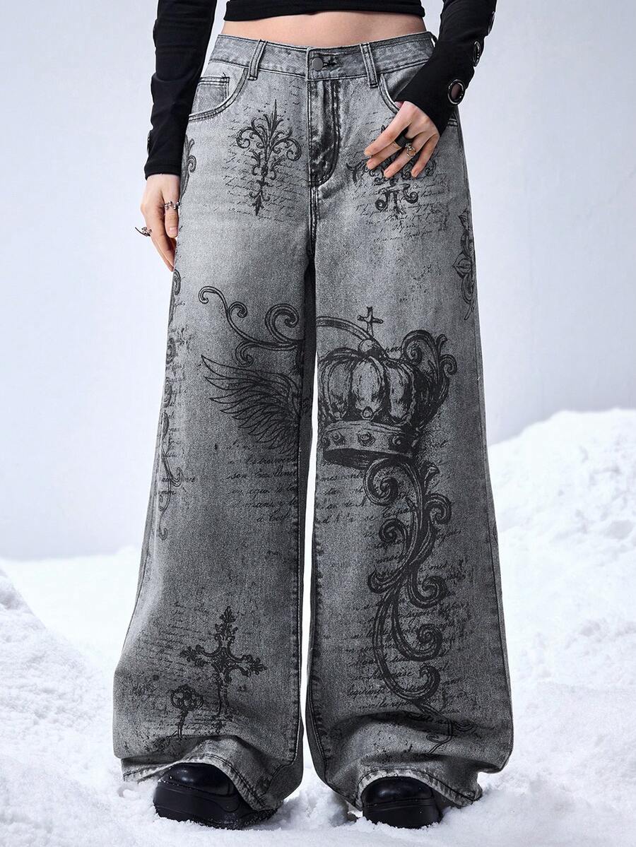 Grunge Punk Jeans amples à jambes larges unisexes avec imprimé vintage d'ange de rue et de couronne de vigne