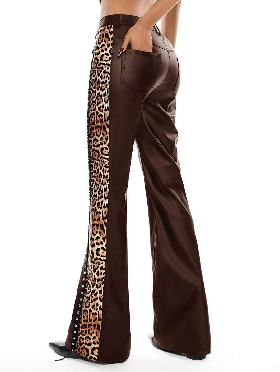 Pantalon évasé stretch à taille basse, avec un design patchwork imprimé léopard et studs pour la Saint-Valentin style Y2K