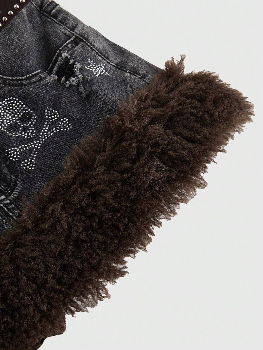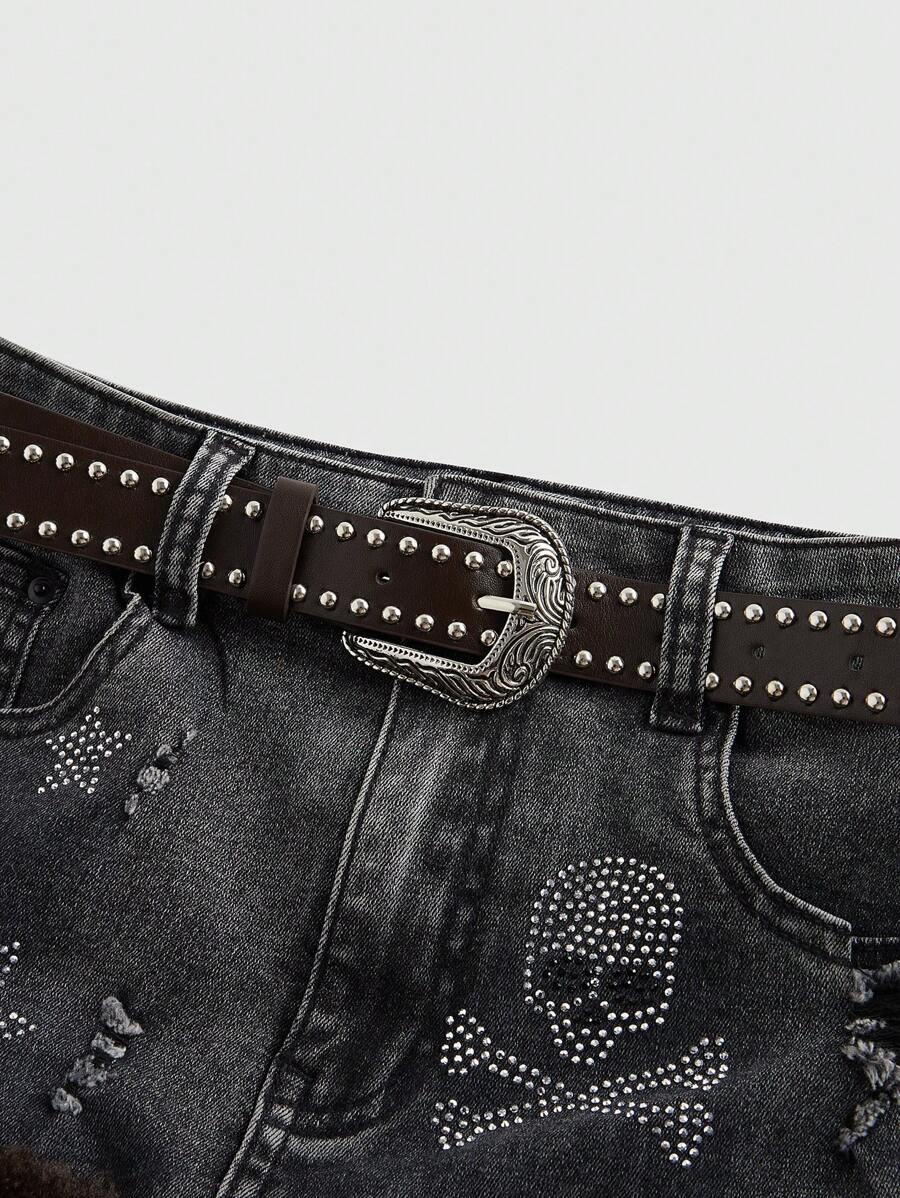 Grunge Punk Jupe en jean vintage effet vieilli avec détails squelette, étoile en strass et bords bruts