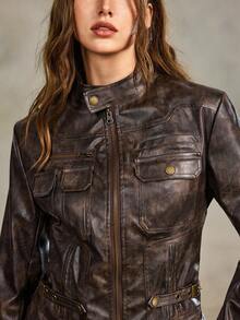 Grunge Punk Veste en PU ajustée, déchirée et à poches multiples, style vintage Y2K Kpop Baddie pour femmes