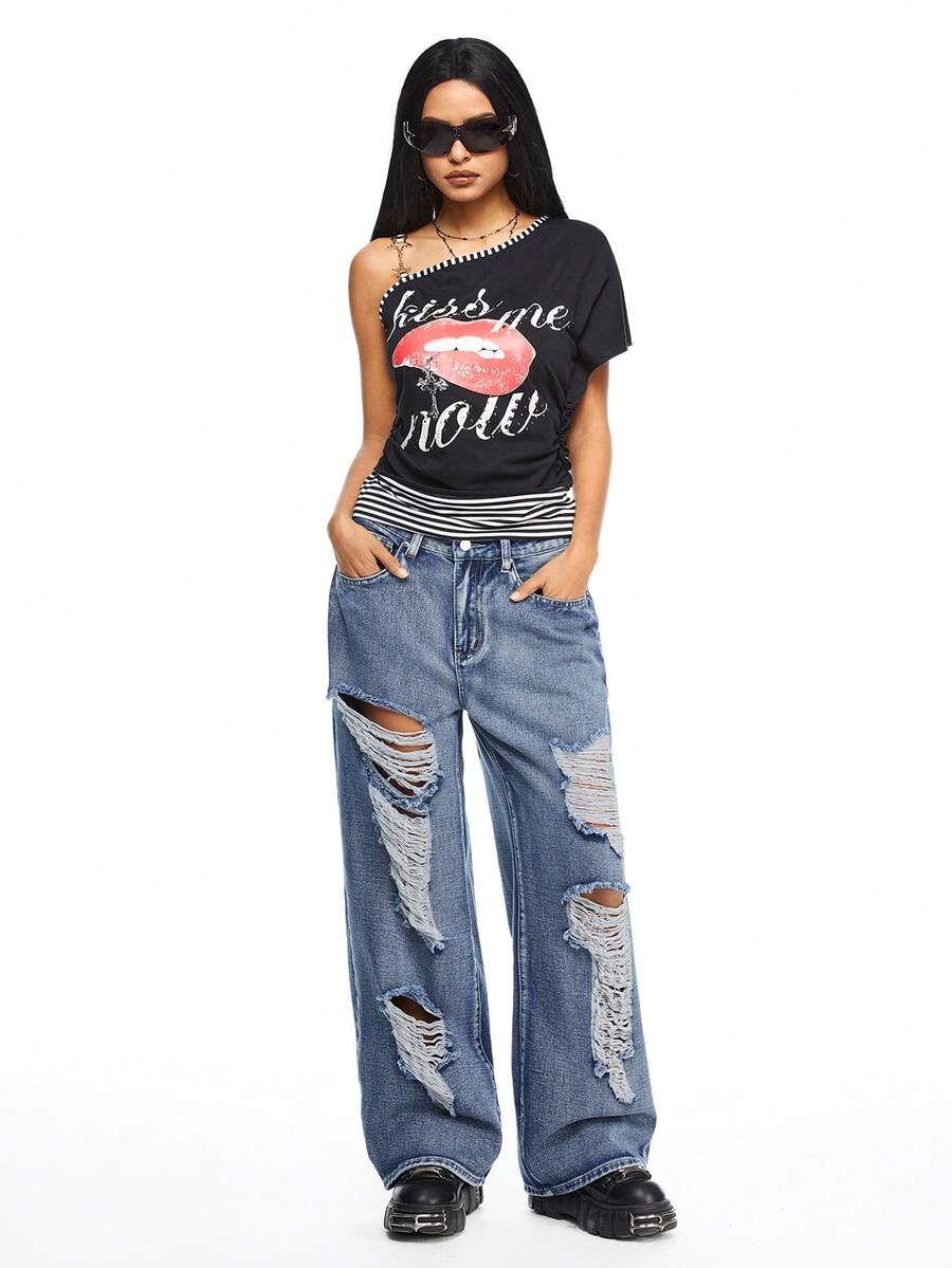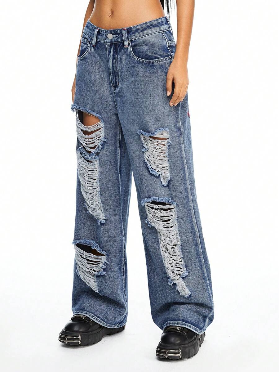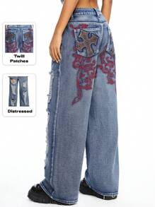 Grunge Punk Jeans en denim casual avec boutons frontaux, poche et broderie croisée pour femmes