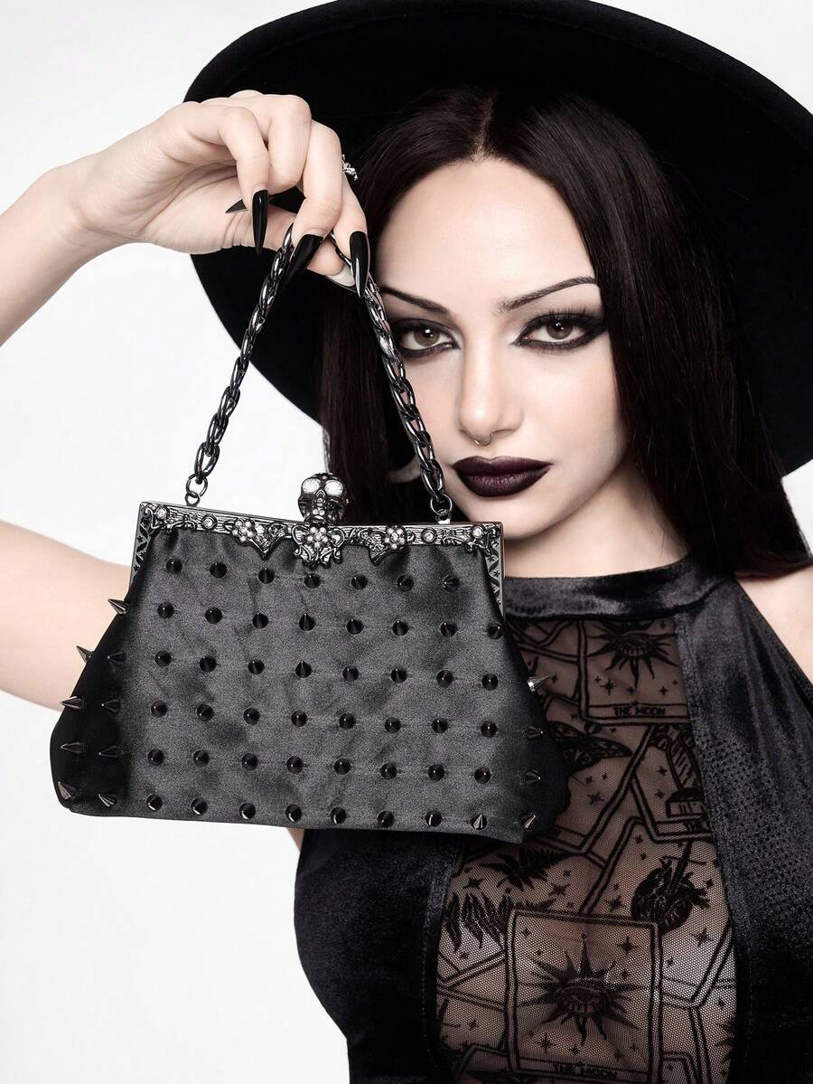 Grunge Punk Sac de soirée pour femme, couleur unie simple avec décoration de rivets, mode