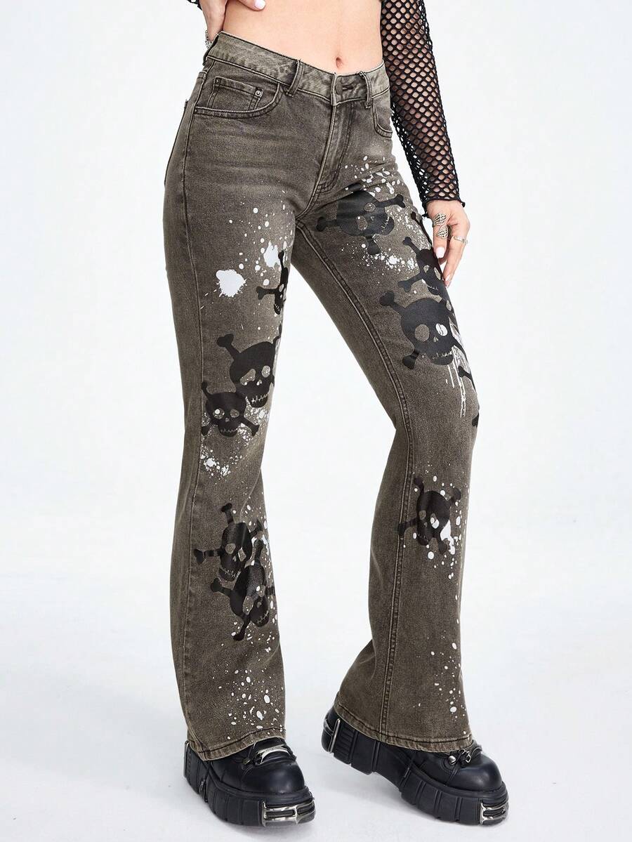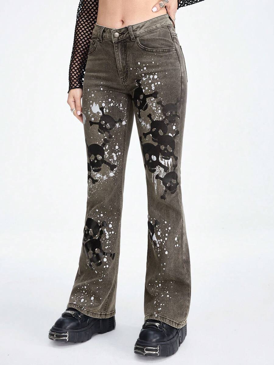 Grunge Punk Jeans évasés avec effet d'éclaboussures d'encre et poche patch squelette pour femmes