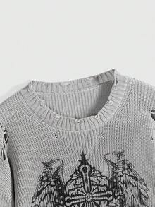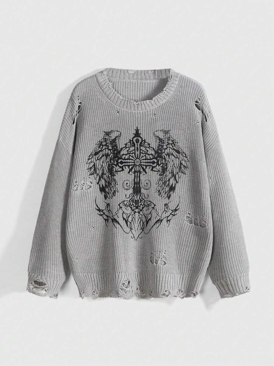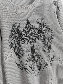 Grunge Punk Femmes Crew Neck Croix et Motif Aile Design Délavé Décontracté Pullover Quotidien, Automne/Hiver