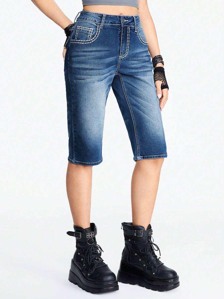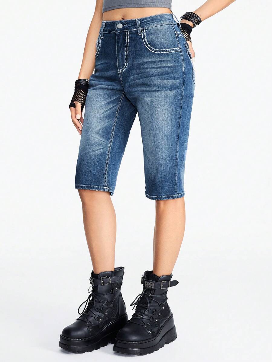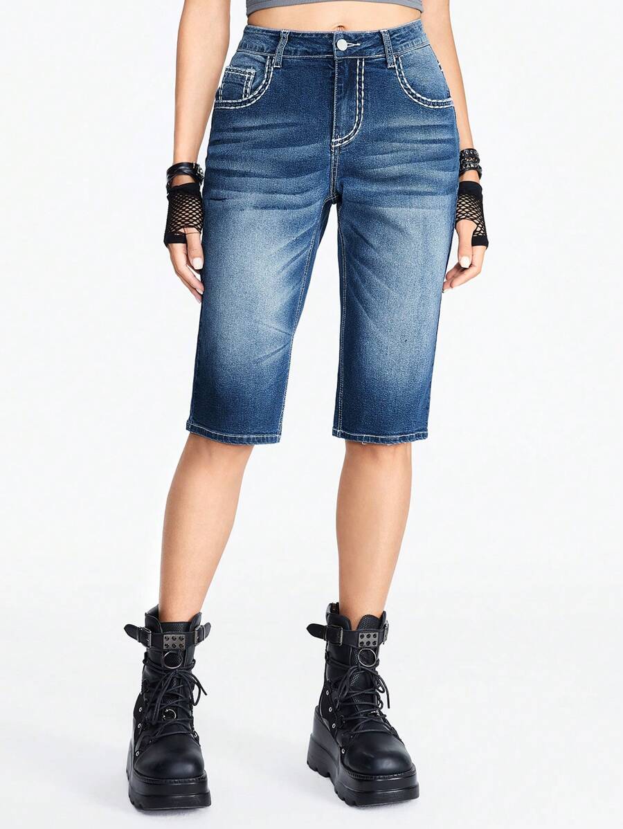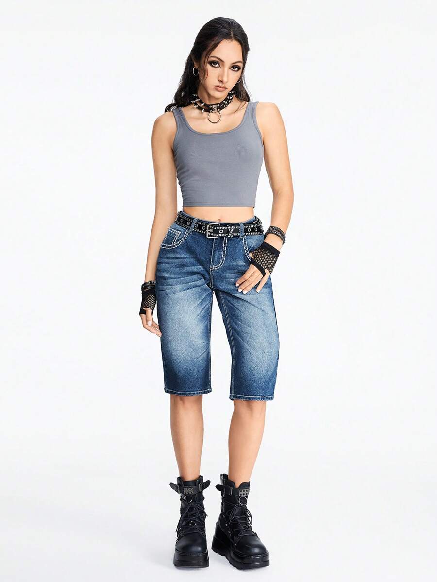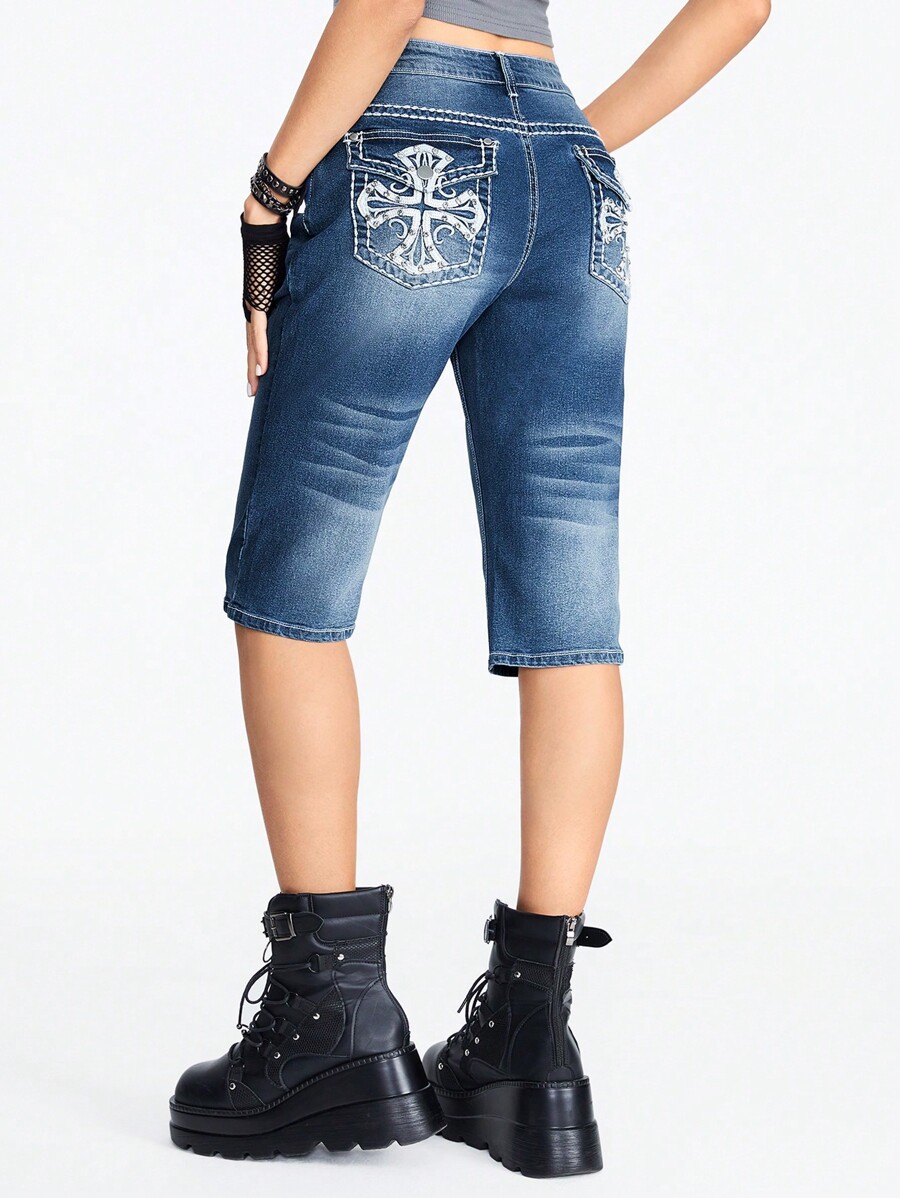 Grunge Punk Short en jean casual pour femme avec imprimé croix et poches, avec revers