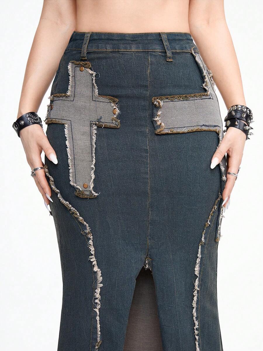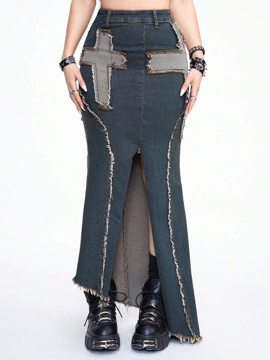 Grunge Punk Jupe en denim à la mode pour femmes avec ourlet effiloché et fente