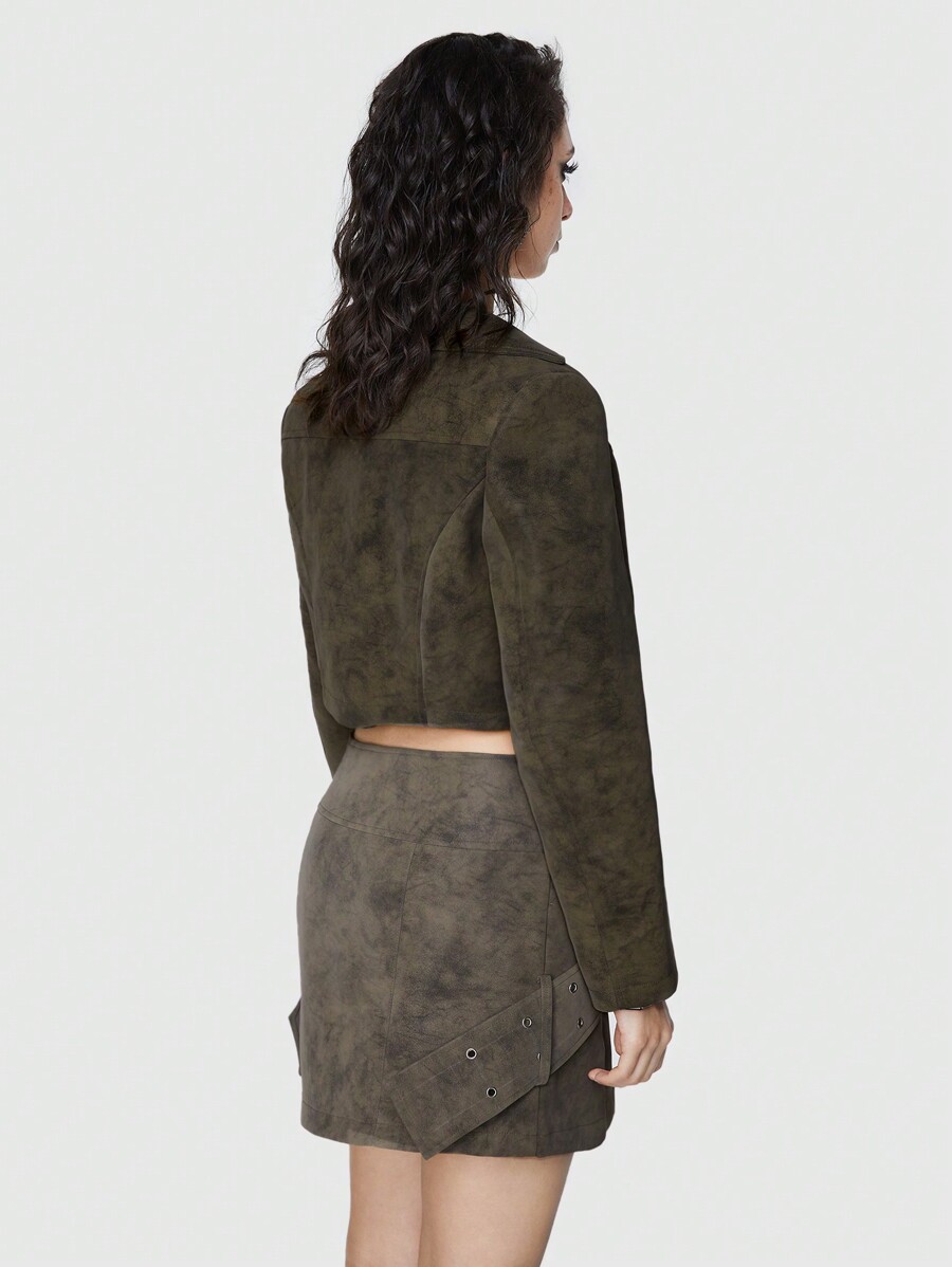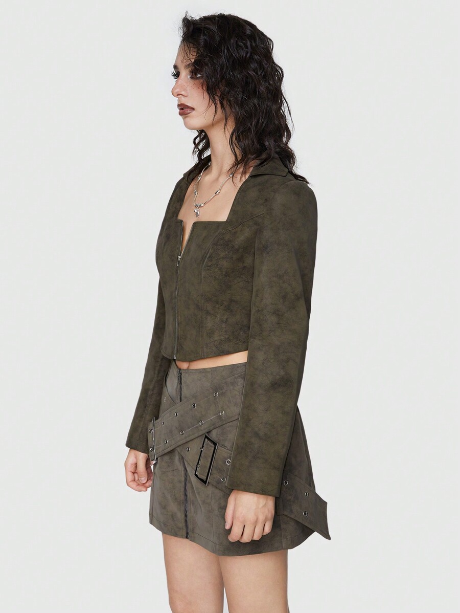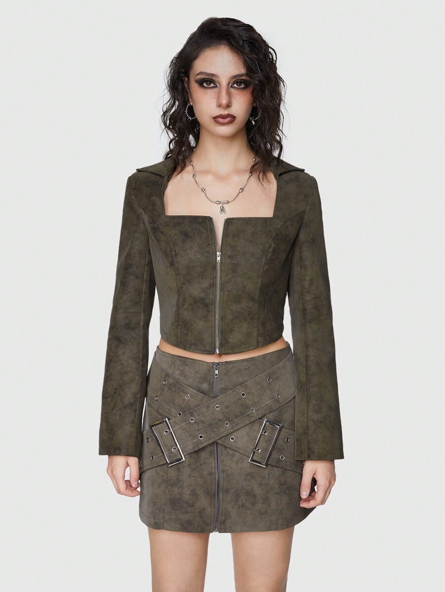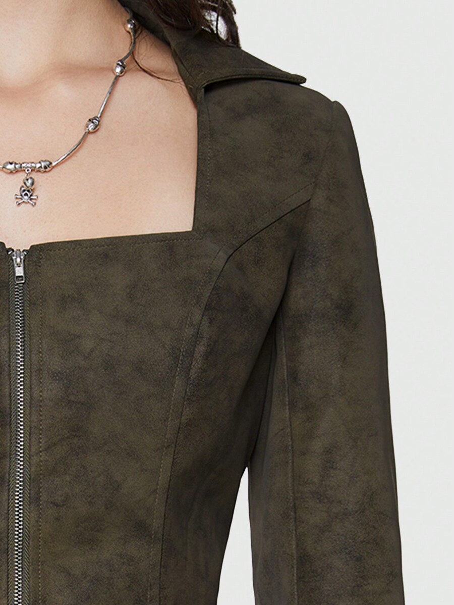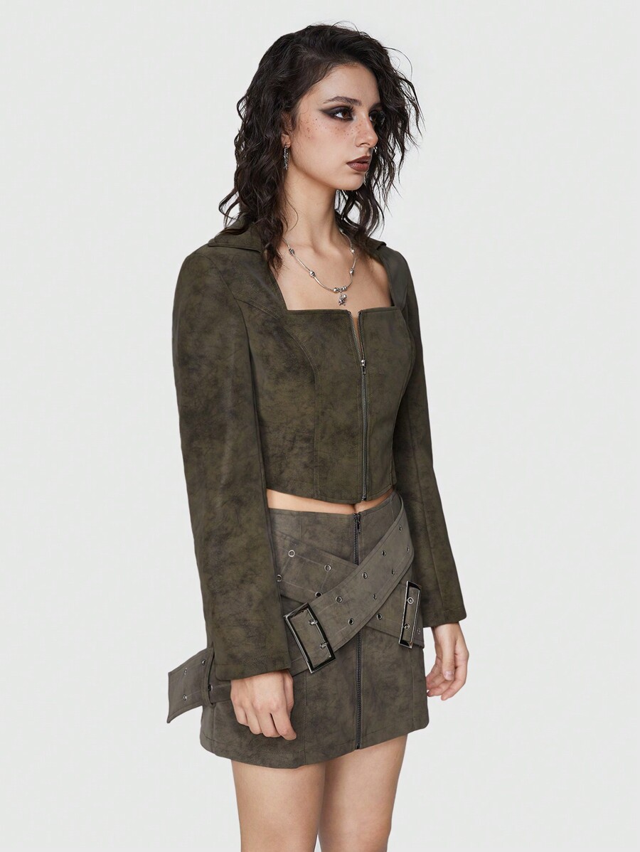 Grunge Punk Haut À Manches Longues À Fermeture Éclair Et Col Carré Pour Femme En Pu