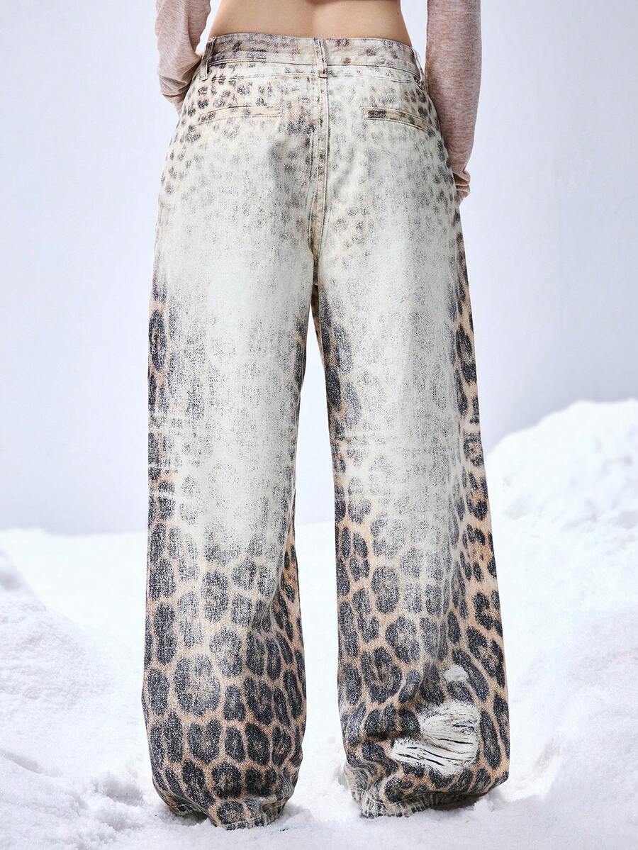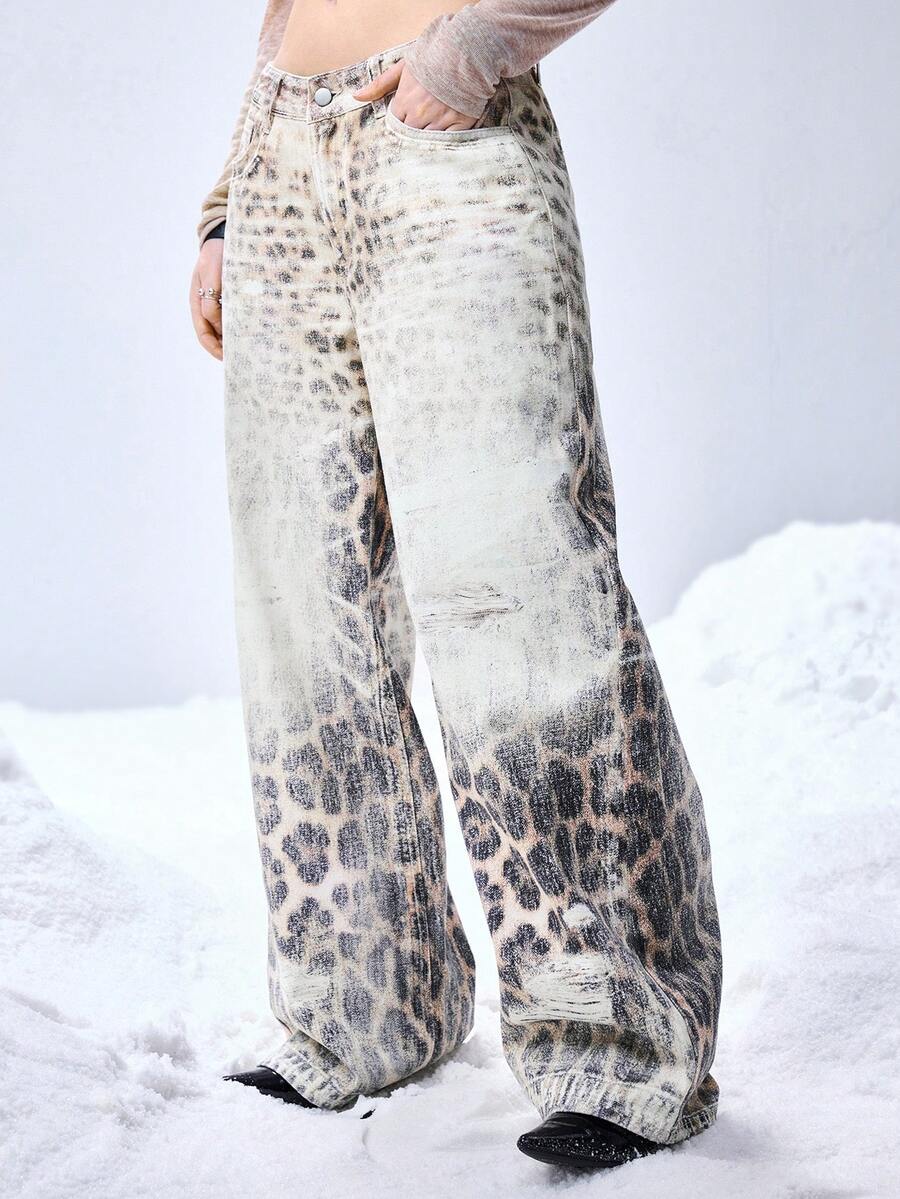 Grunge Punk Jeans larges à taille basse, lâches et à jambes évasées, avec un dégradé léopard, dans le style mode de rue Y2K pour femmes
