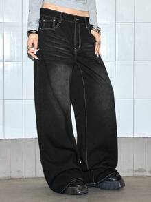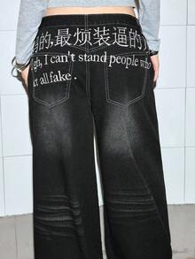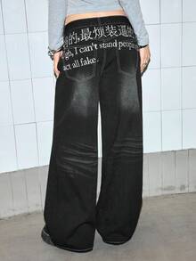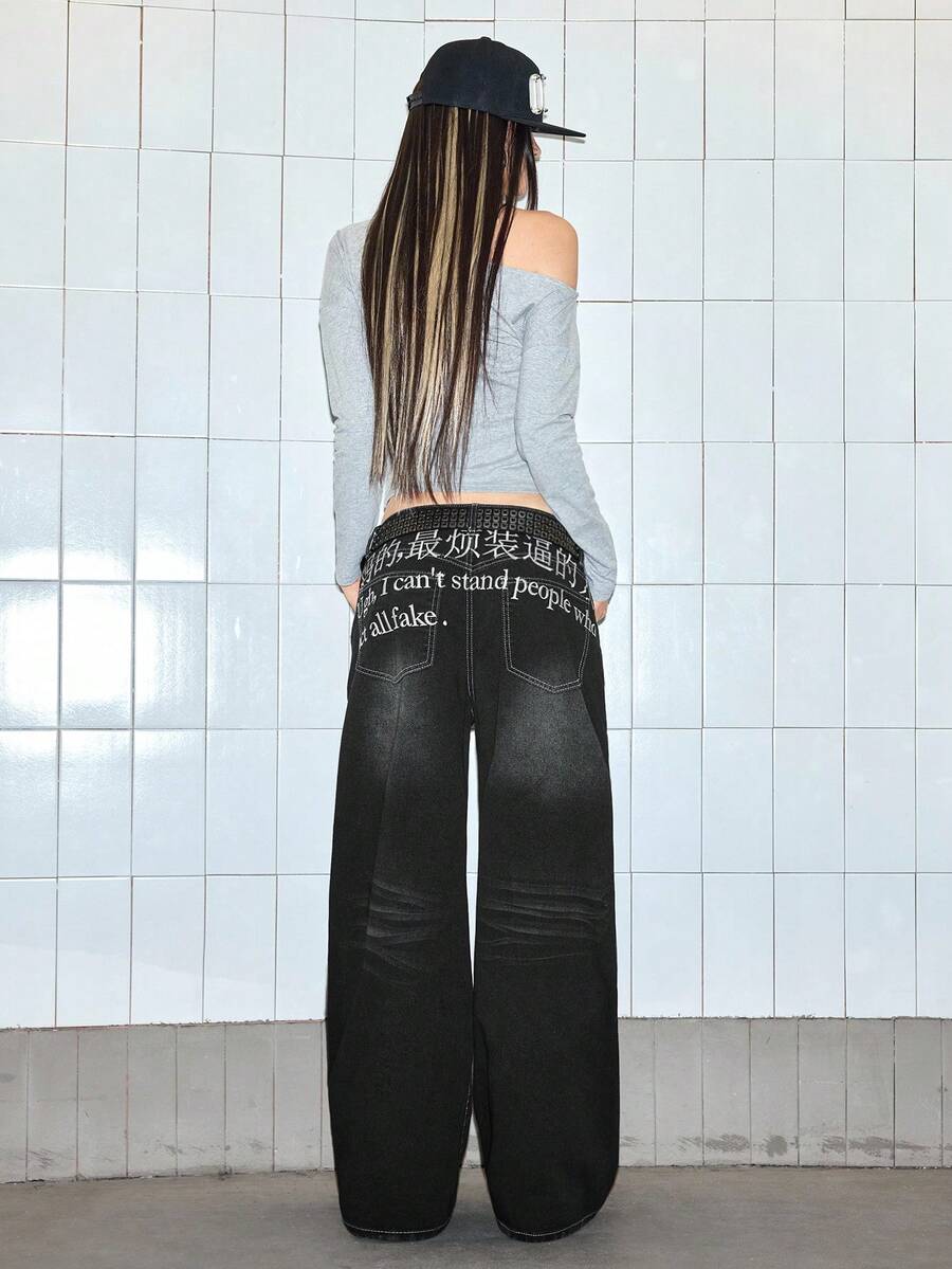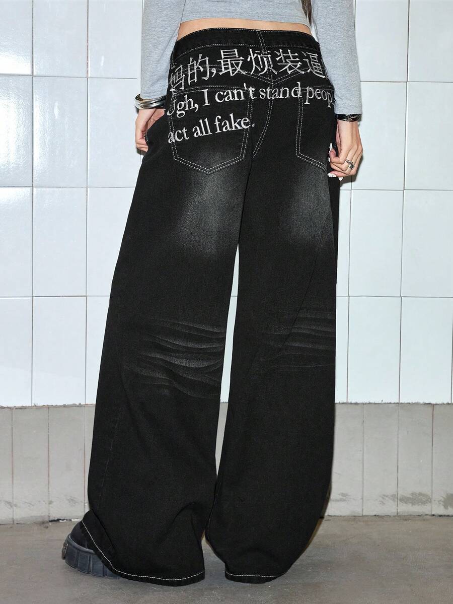Grunge Punk Jeans larges à jambes évasées avec slogan en chinois et en anglais brodé, style de rue Y2K pour femmes