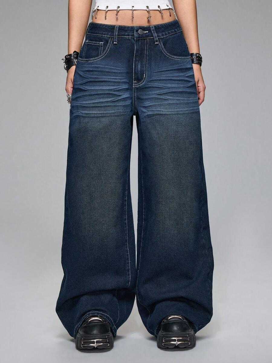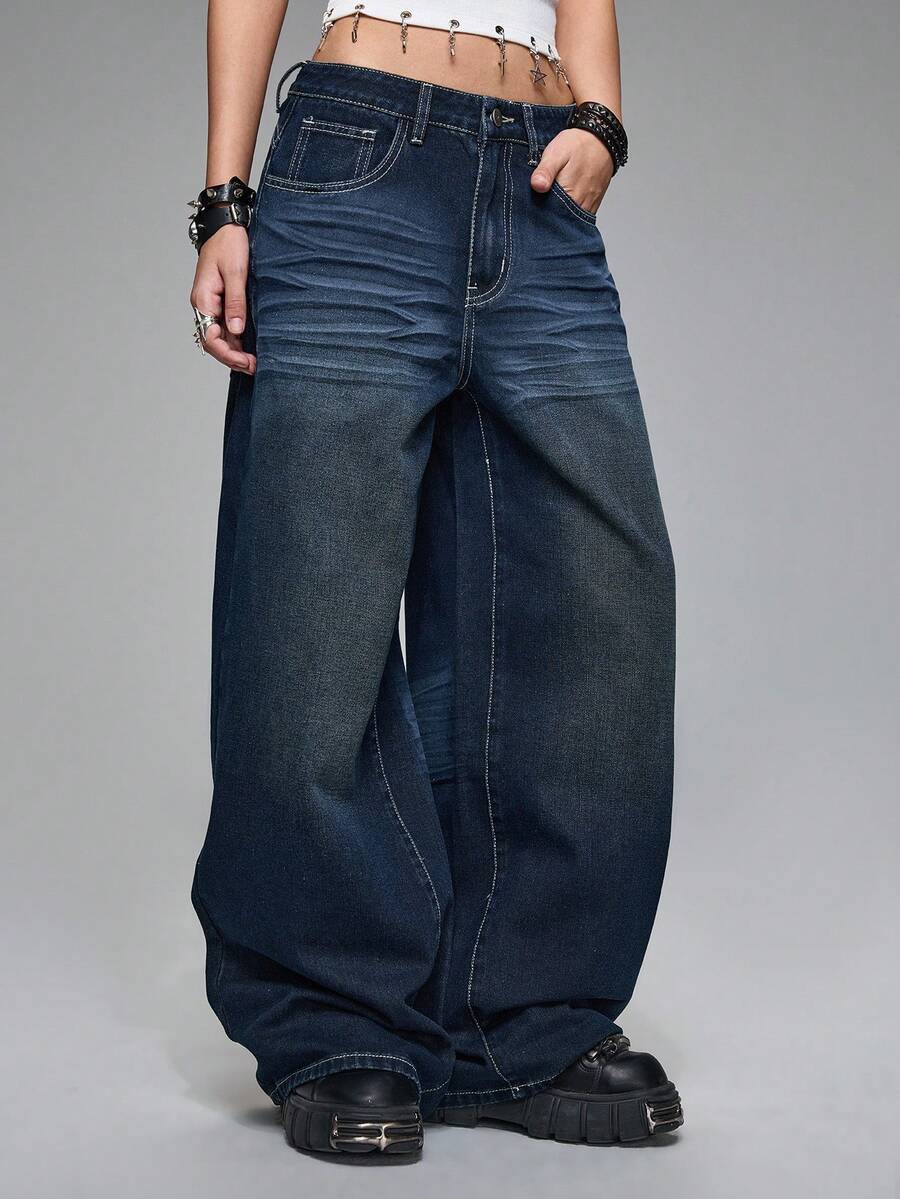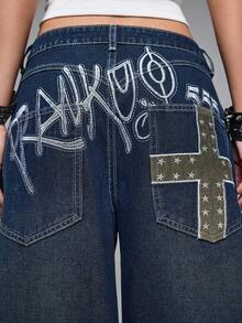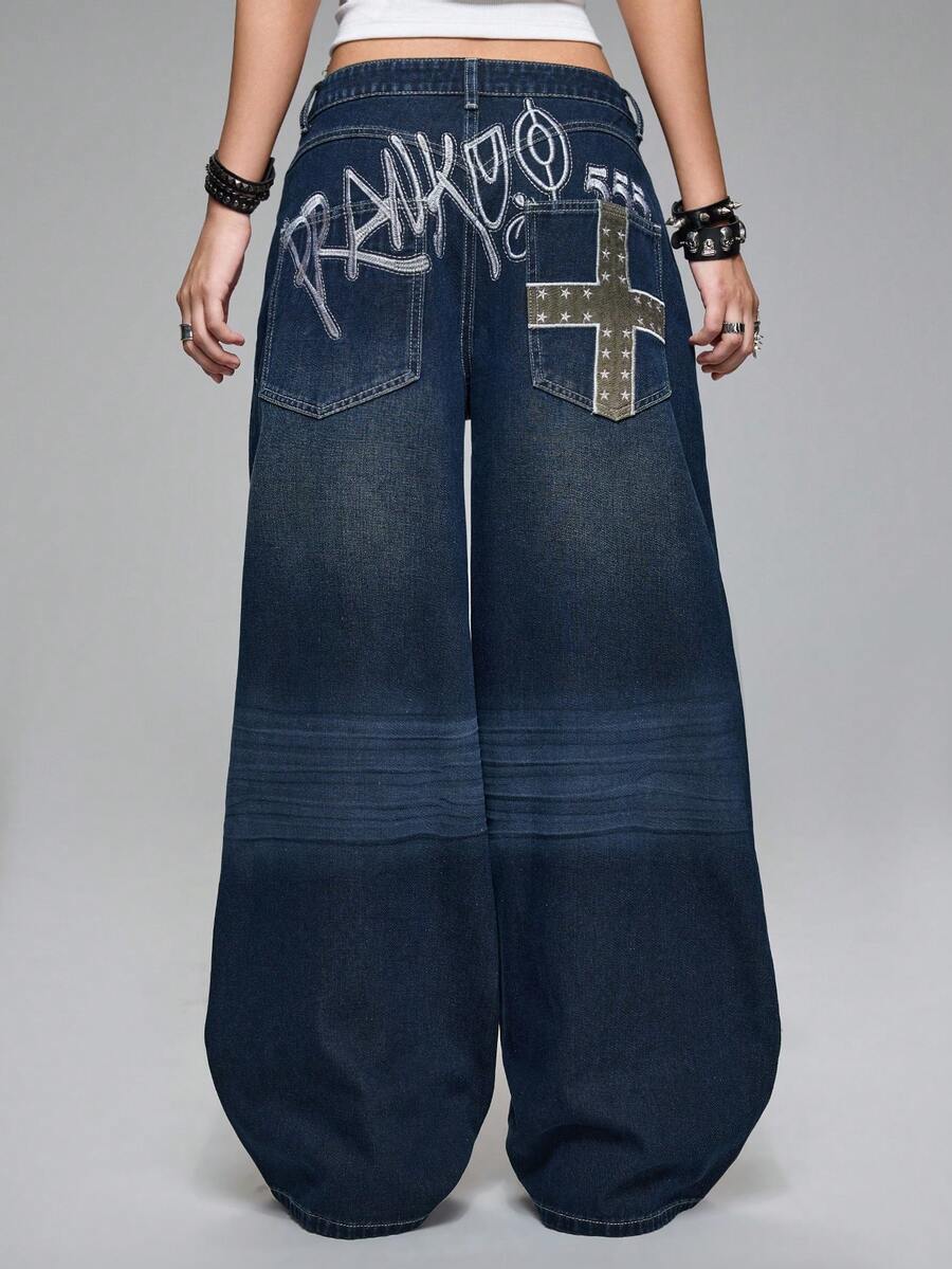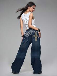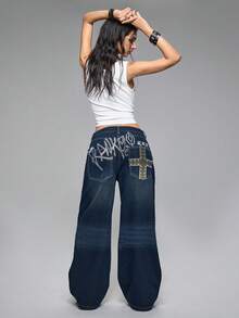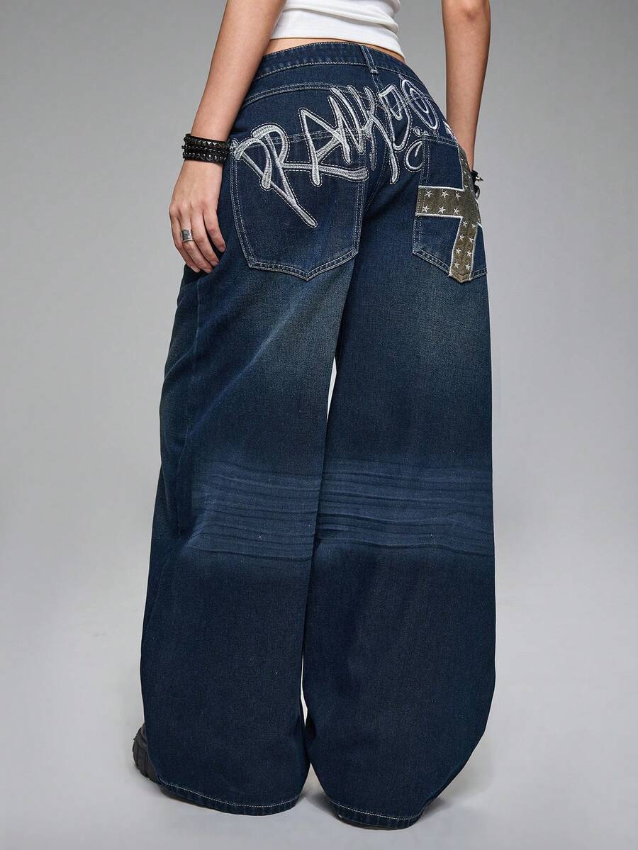 Grunge Punk Jeans femme à taille très basse, coupe ample et jambes larges, avec lettres et croix brodées et effet délavé, style Y2K chic