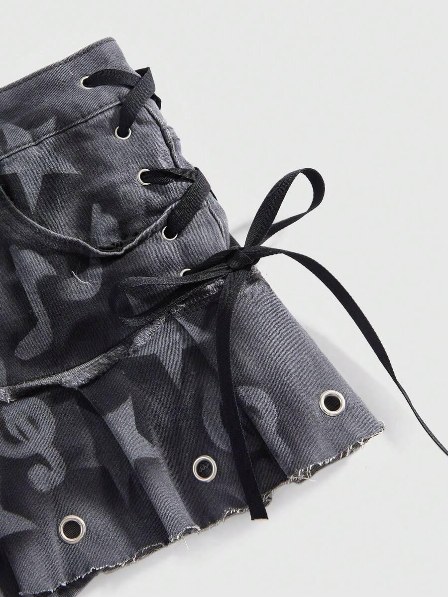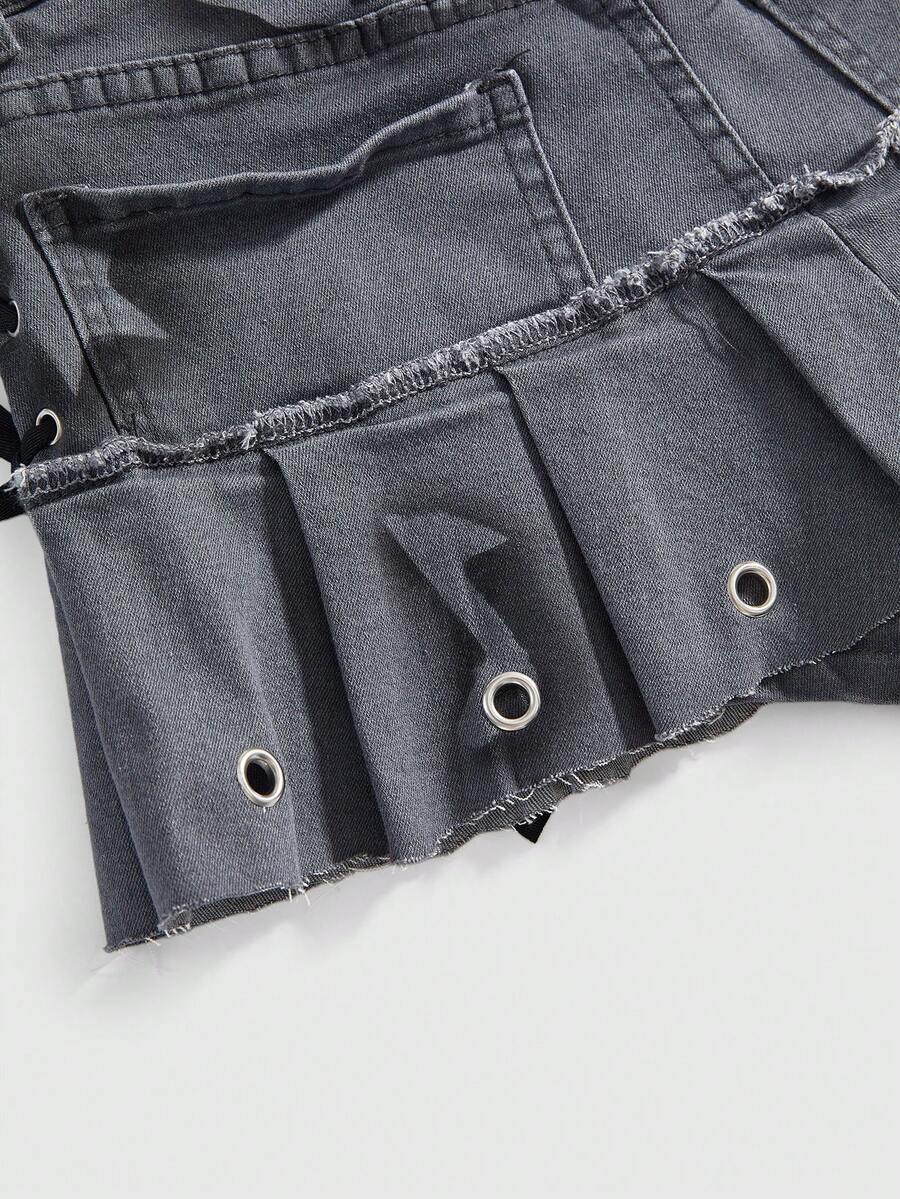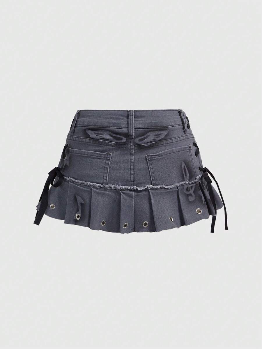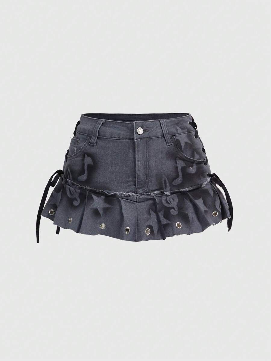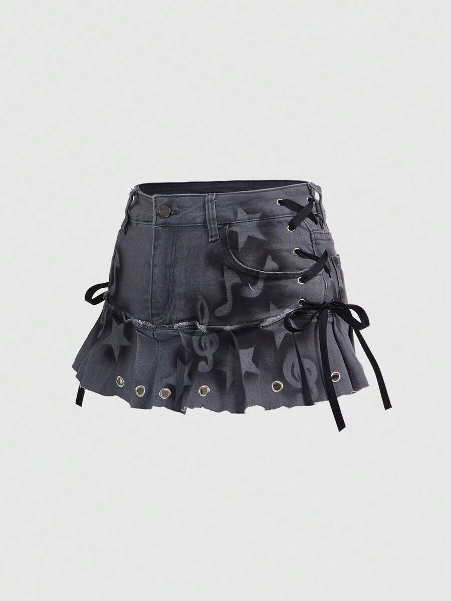 Grunge Punk Jupe mini en jean plissée à taille basse super courte avec motif de notes de musique, style Y2K rétro sexy