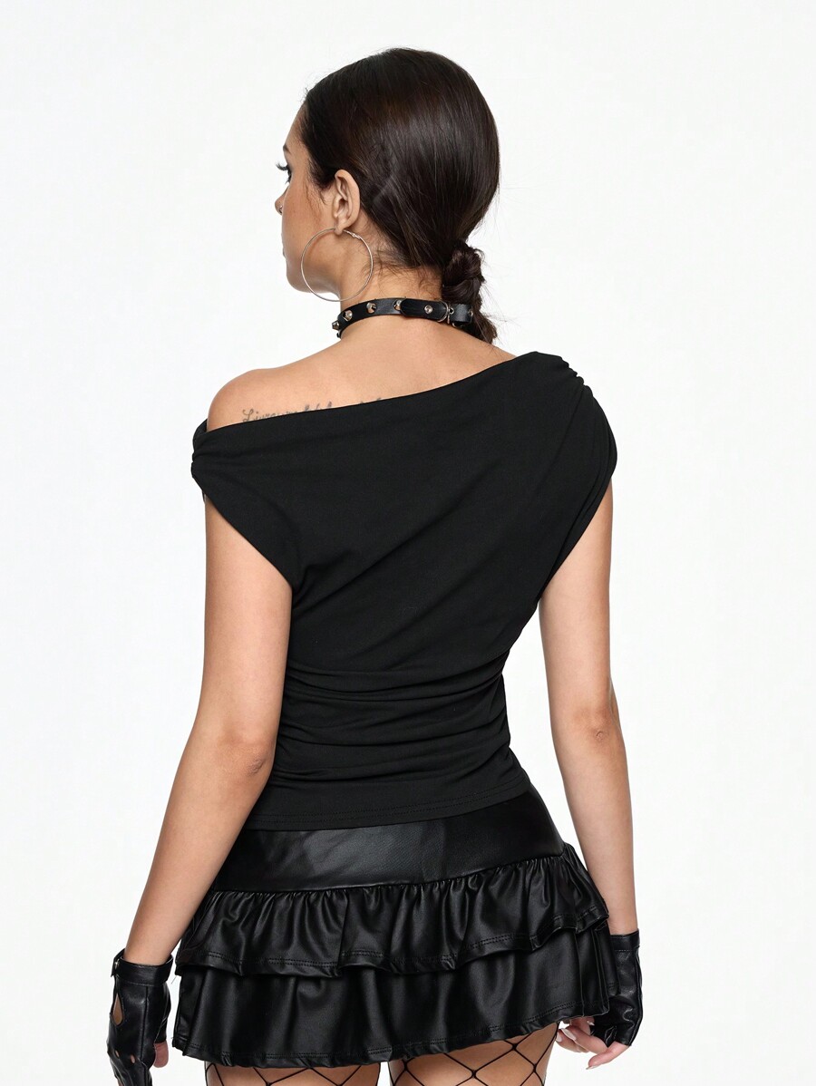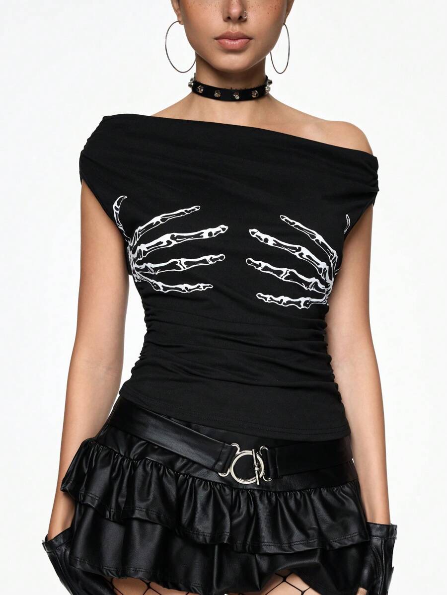 Grunge Punk T-shirt femme imprimé crâne et paume, style Shibuya fille Y2K, coupe étroite à l'épaule plissée, style rétro années 2000. Convient pour des tenues de concert, de rave, de carnaval, de concert country, et des looks d'été pour femmes