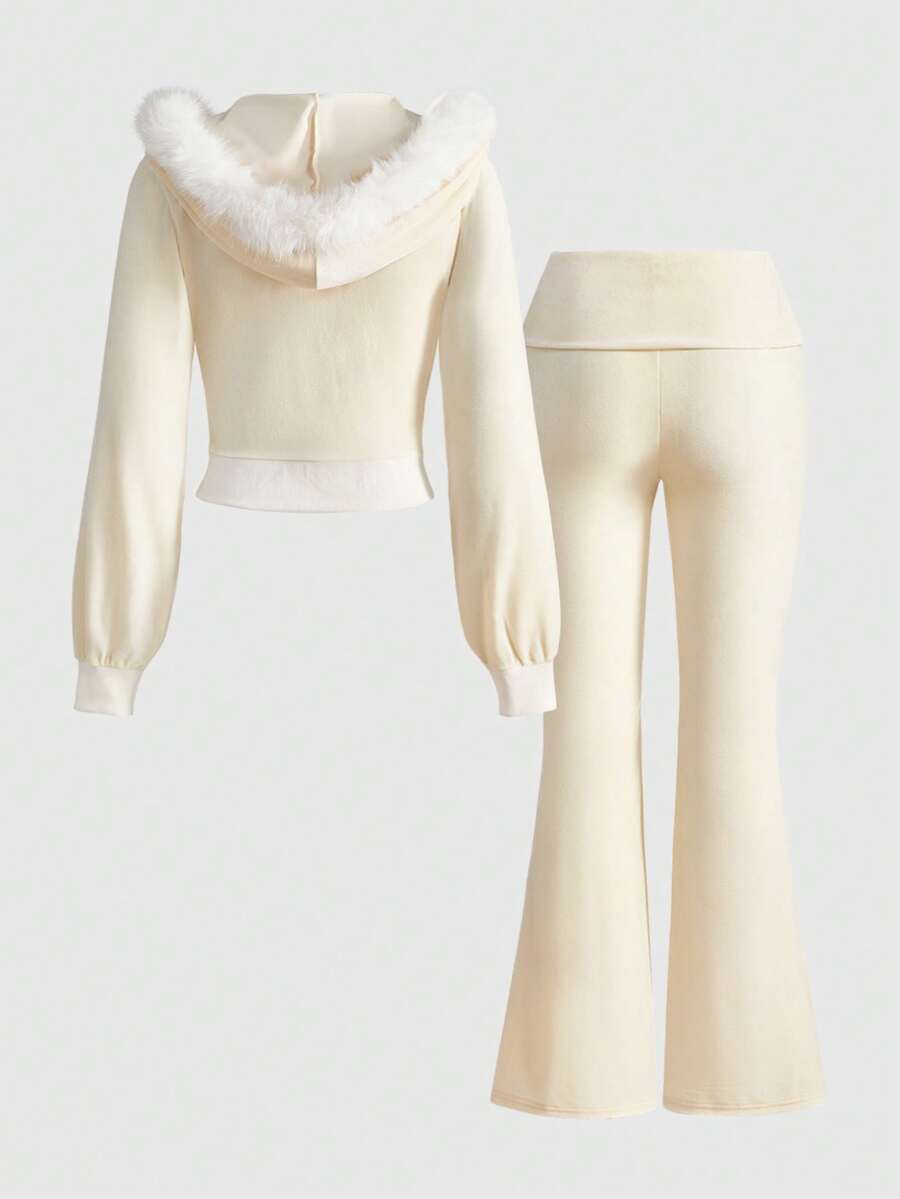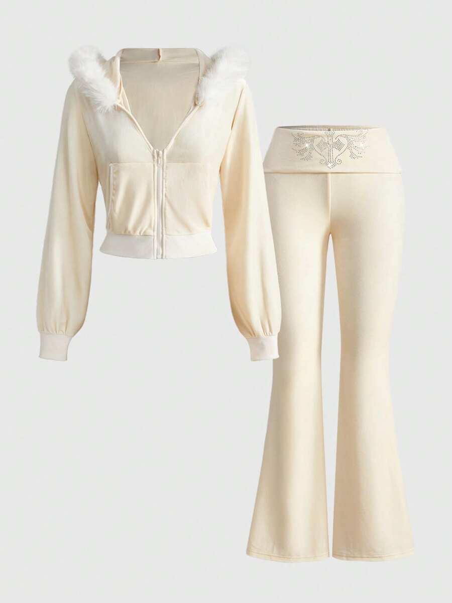 Grunge Punk Ensemble 2 pièces composé d'un sweat-shirt à capuche court en velours et d'un pantalon évasé taille basse pour femmes, style Y2K