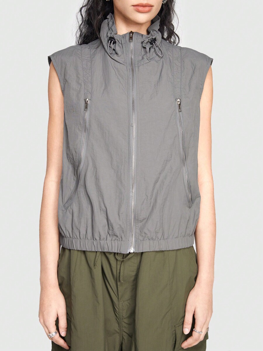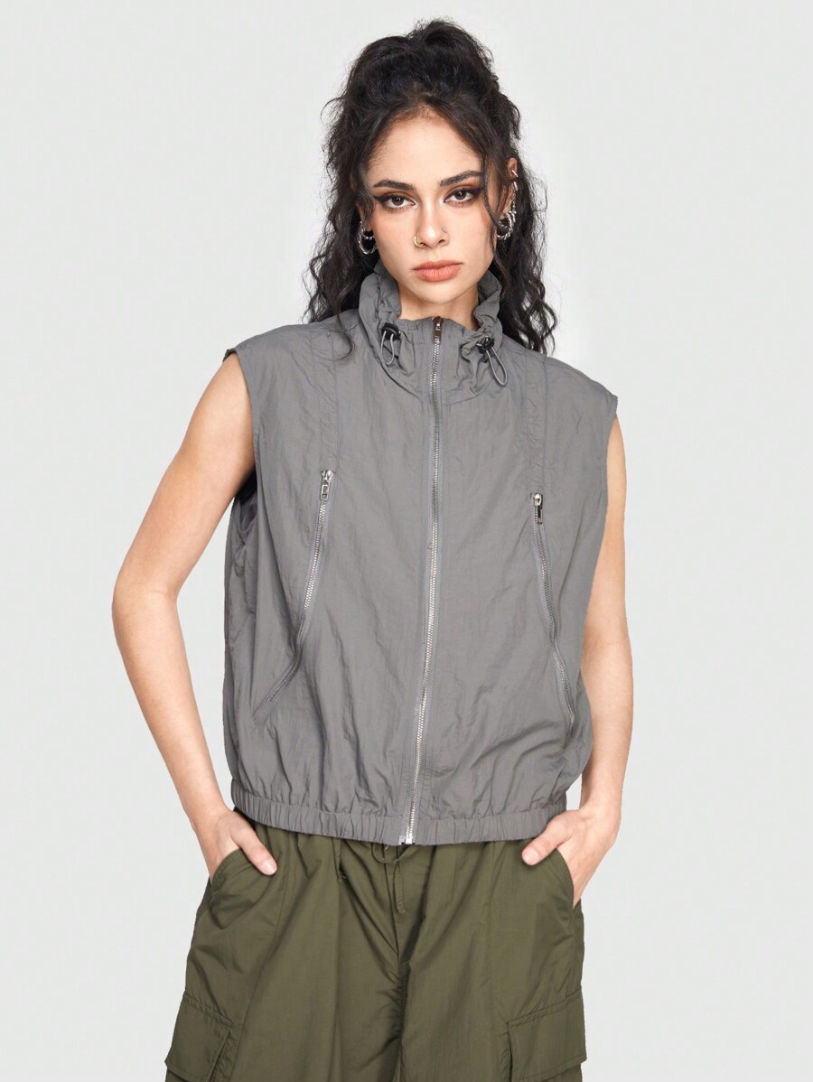 Grunge Punk Veste Sans Manches À Col Montant Et Fermeture À Glissière Avec Cordon De Serrage