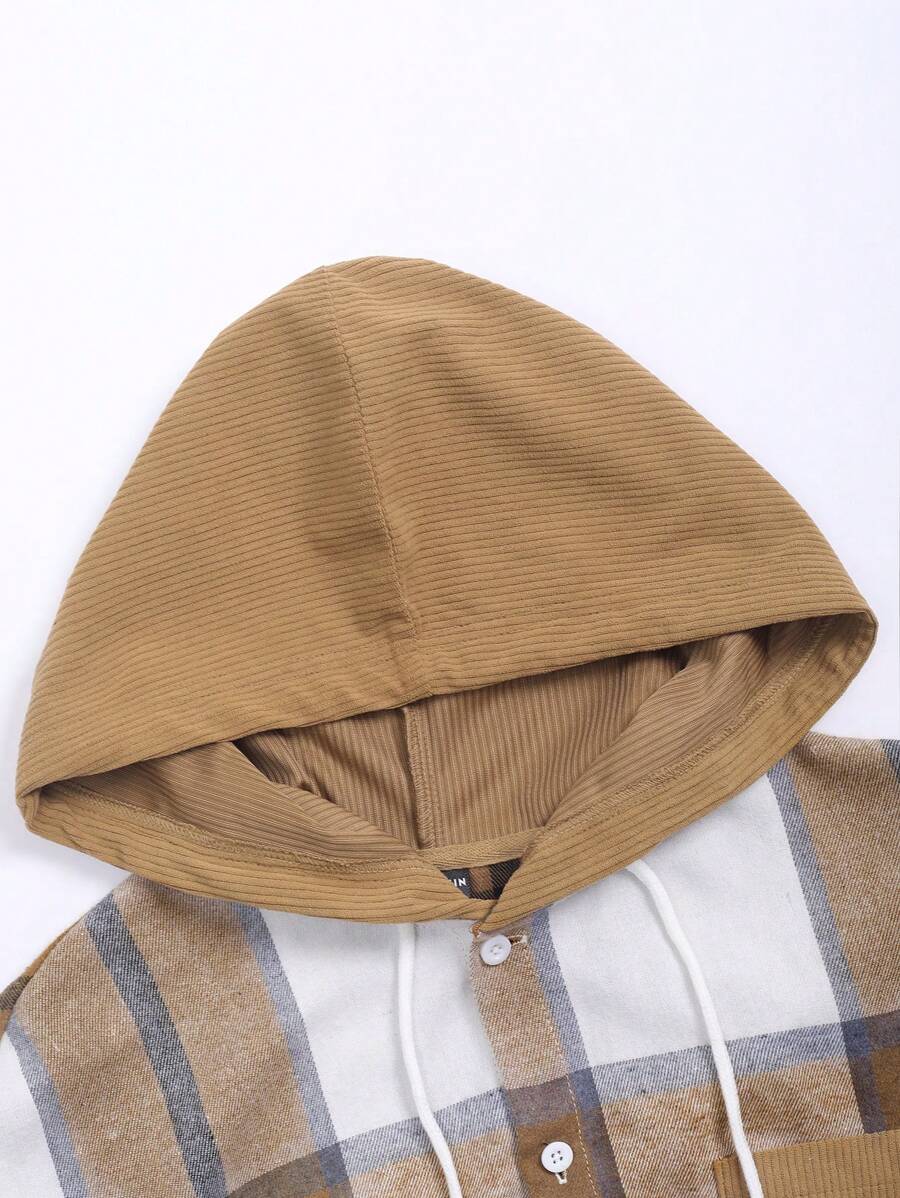 Chemise à manches longues décontractée pour hommes avec capuche à cordon de serrage et poche, motif à carreaux et patchs, sans t-shirt, pour la sortie, automne