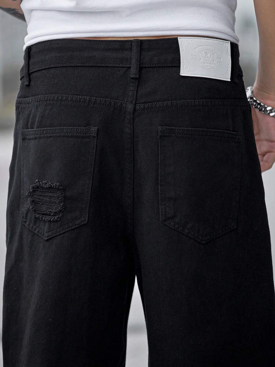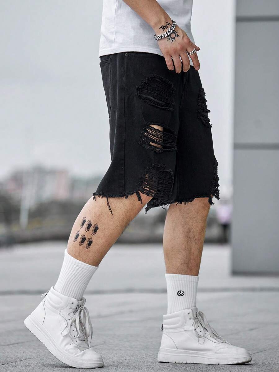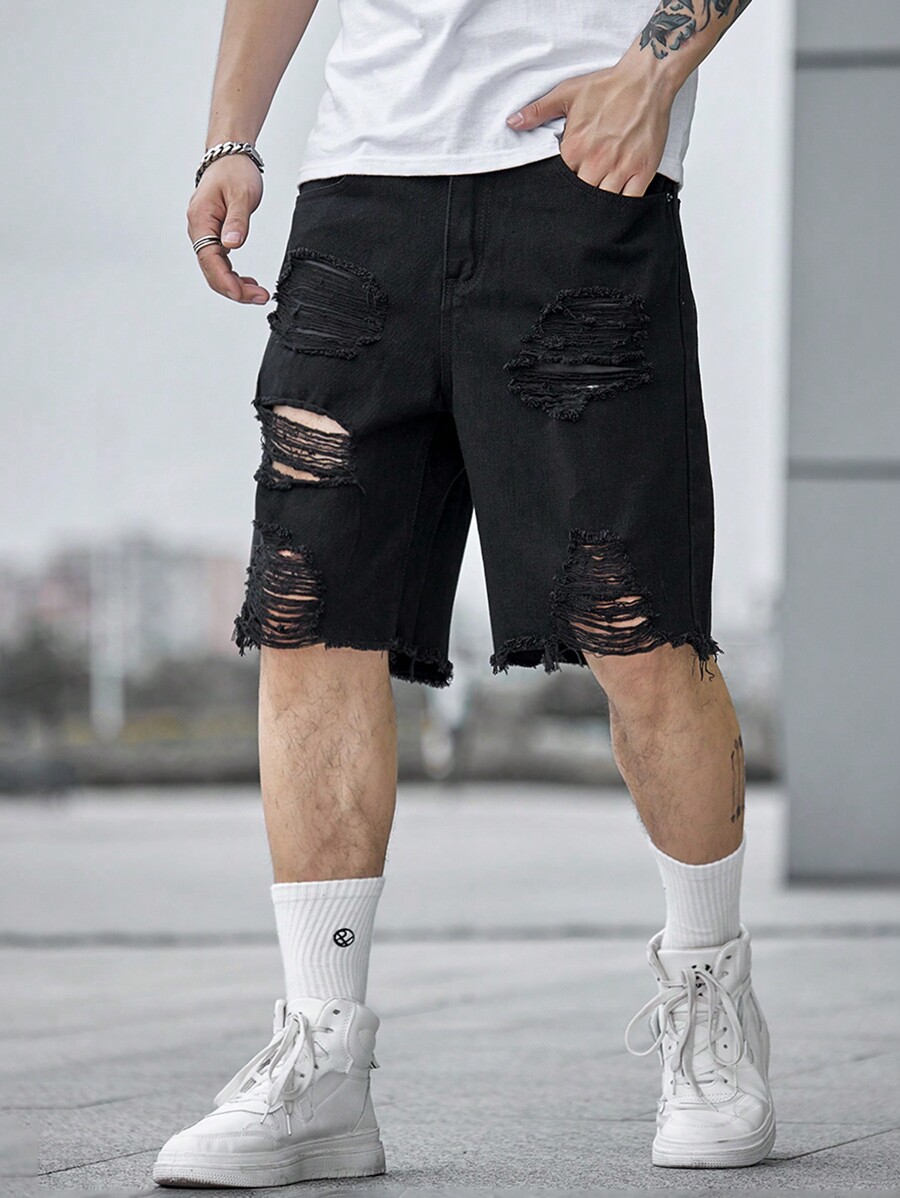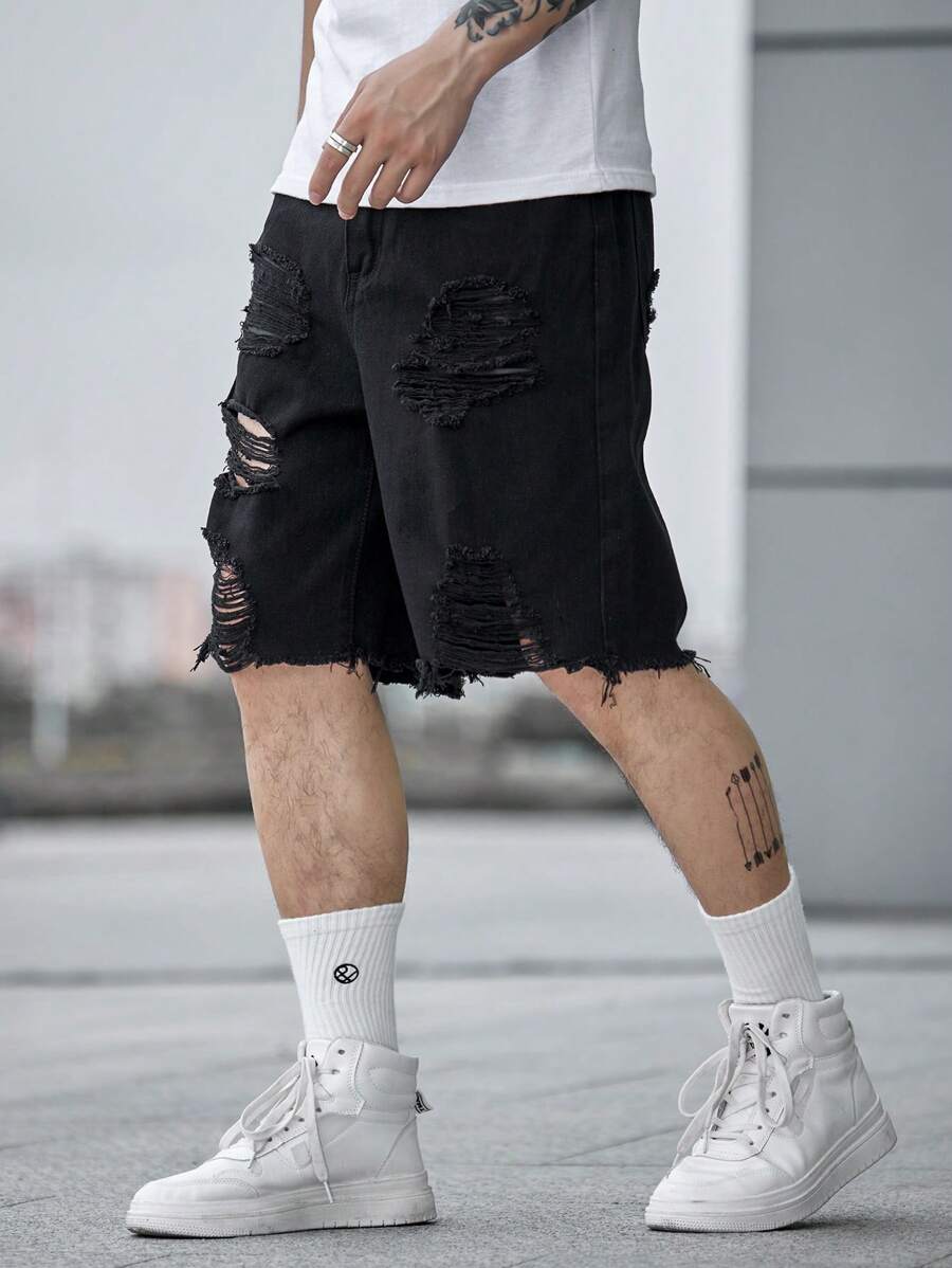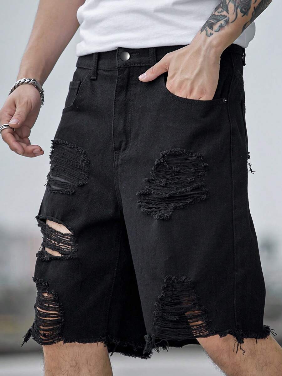 Shorts en denim déchirés en coton avec ourlet brut pour hommes, jorts en denim uni, shorts en denim baggy noirs pour vacances. Idéal pour mari, cadeau pour petit ami
