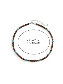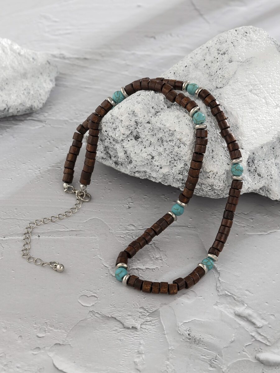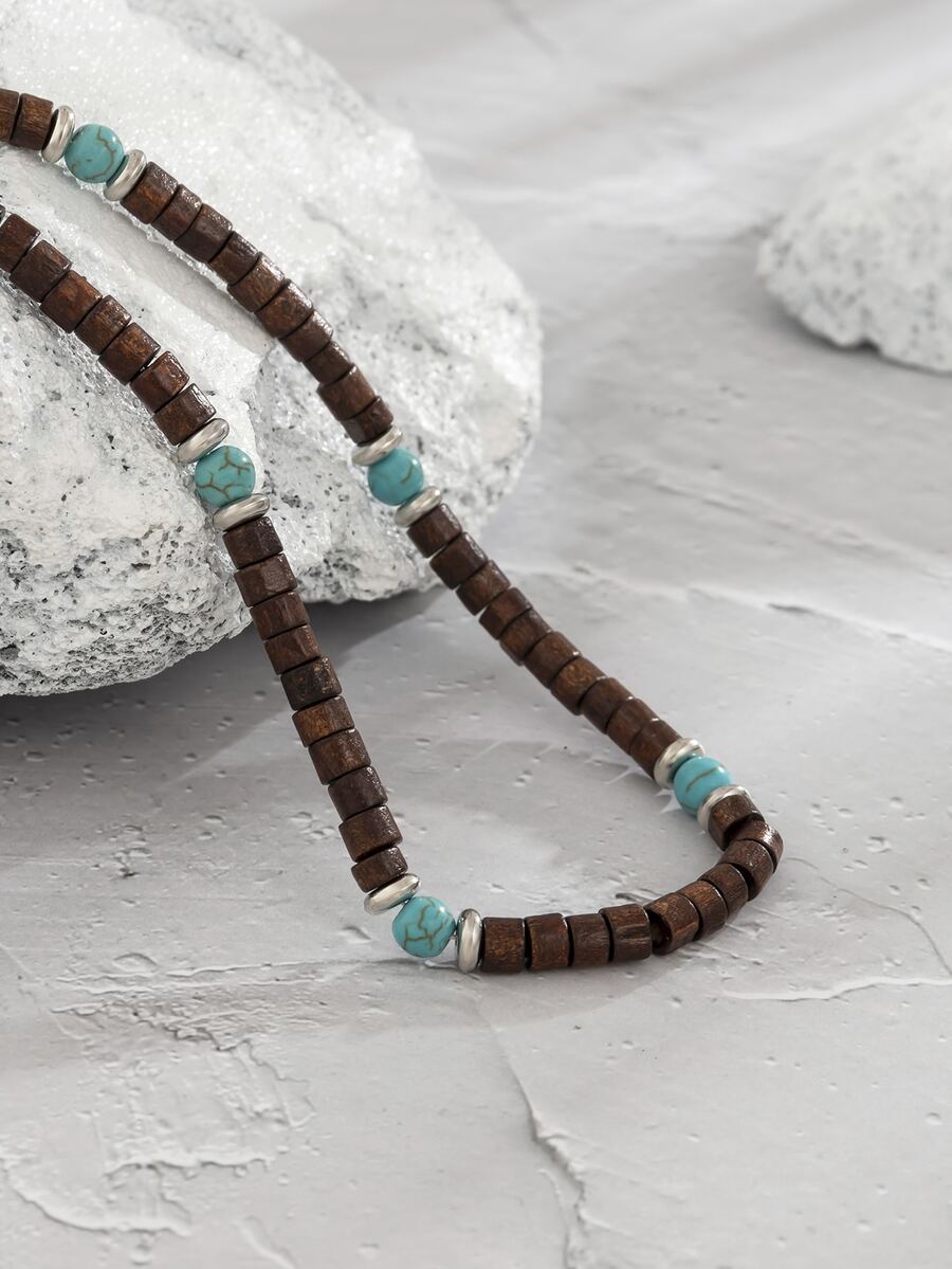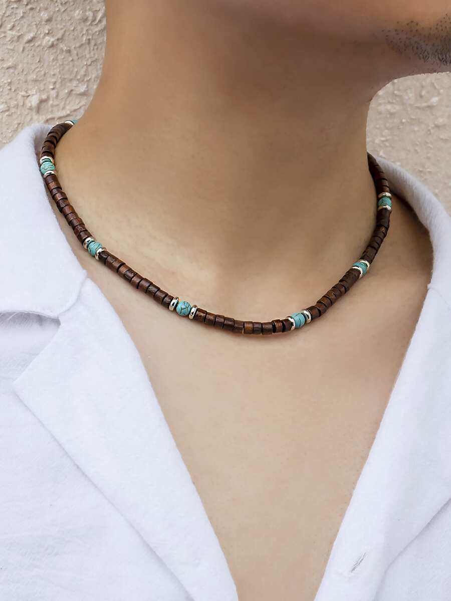 Homme Collier à perles à détail turquoise en bois