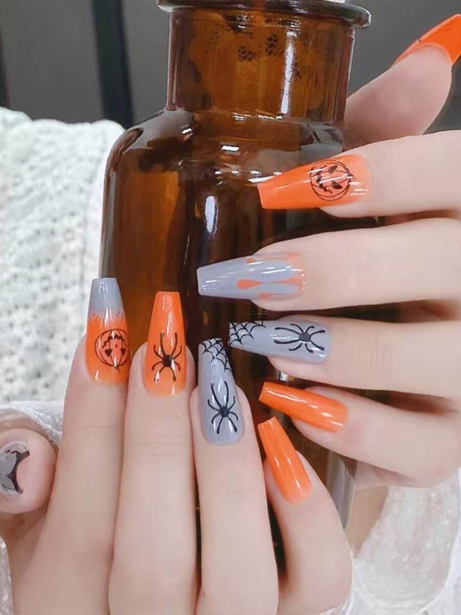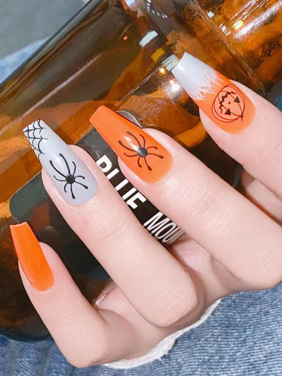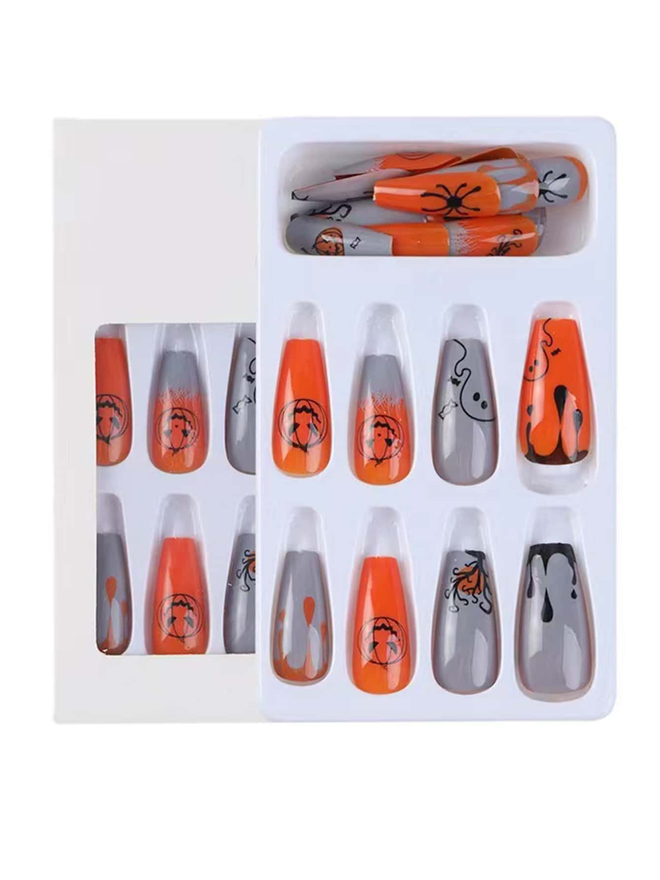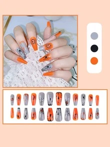 24 pièces Faux ongles halloween long cercueil à imprimé citrouille
