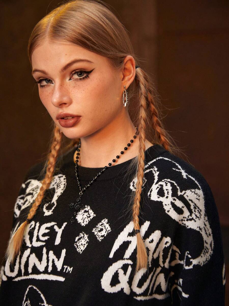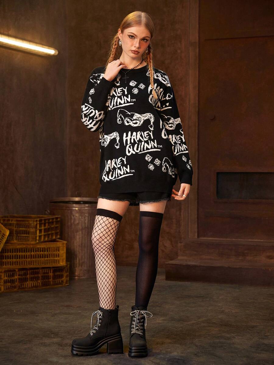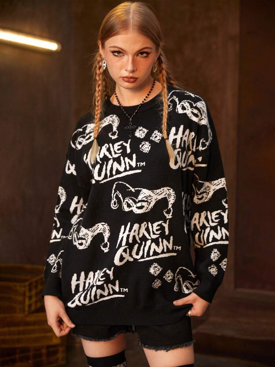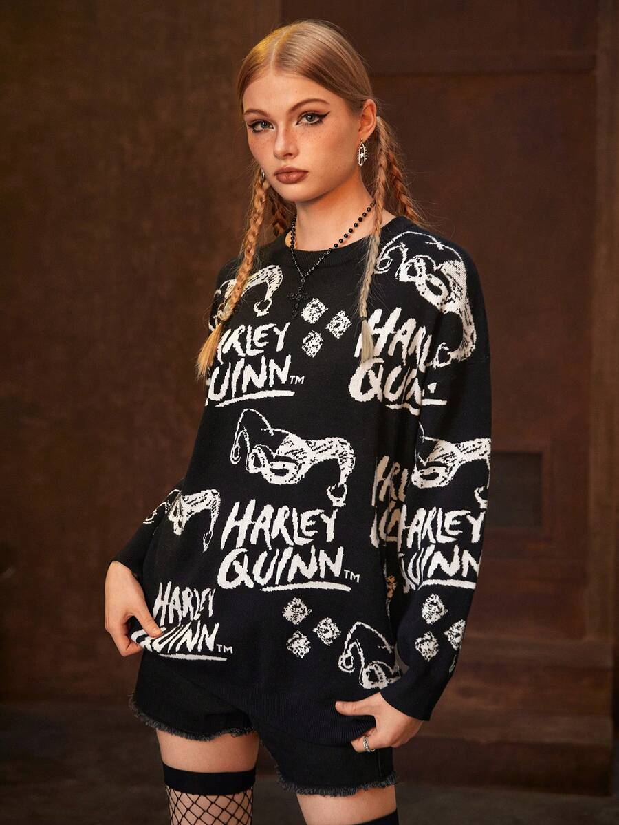 Harley Quinn | ROMWE Pull oversize à épaules tombantes avec motif de dessin animé et de lettres