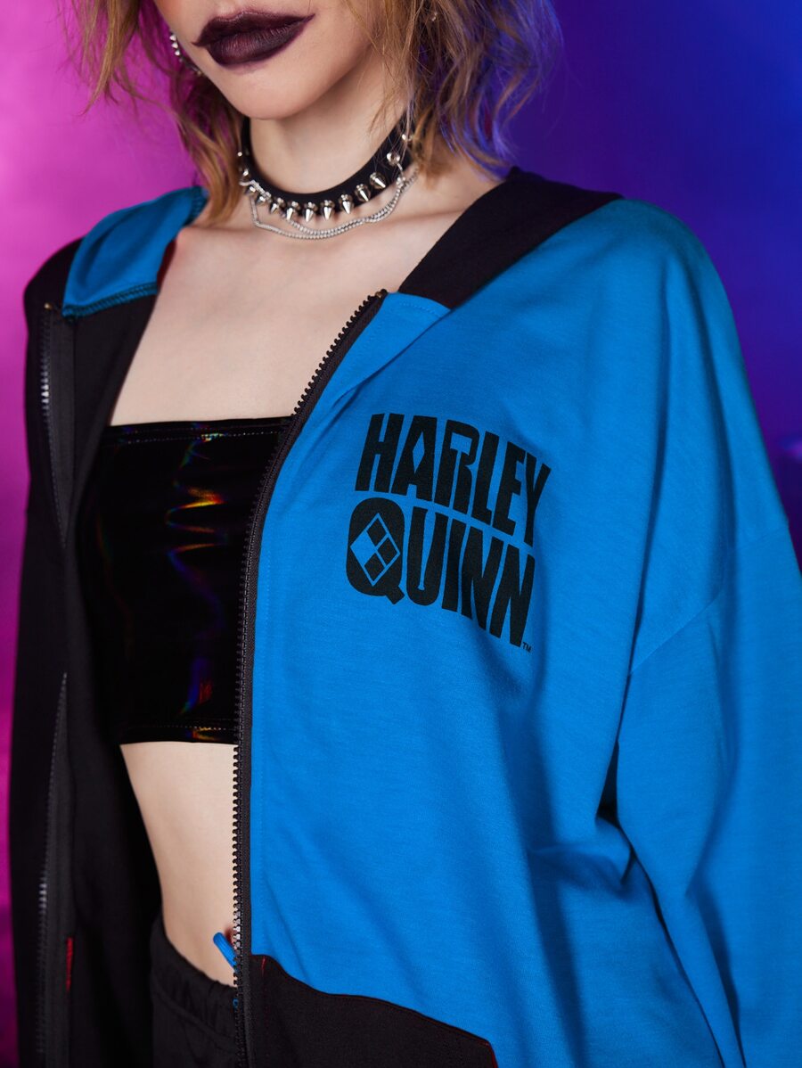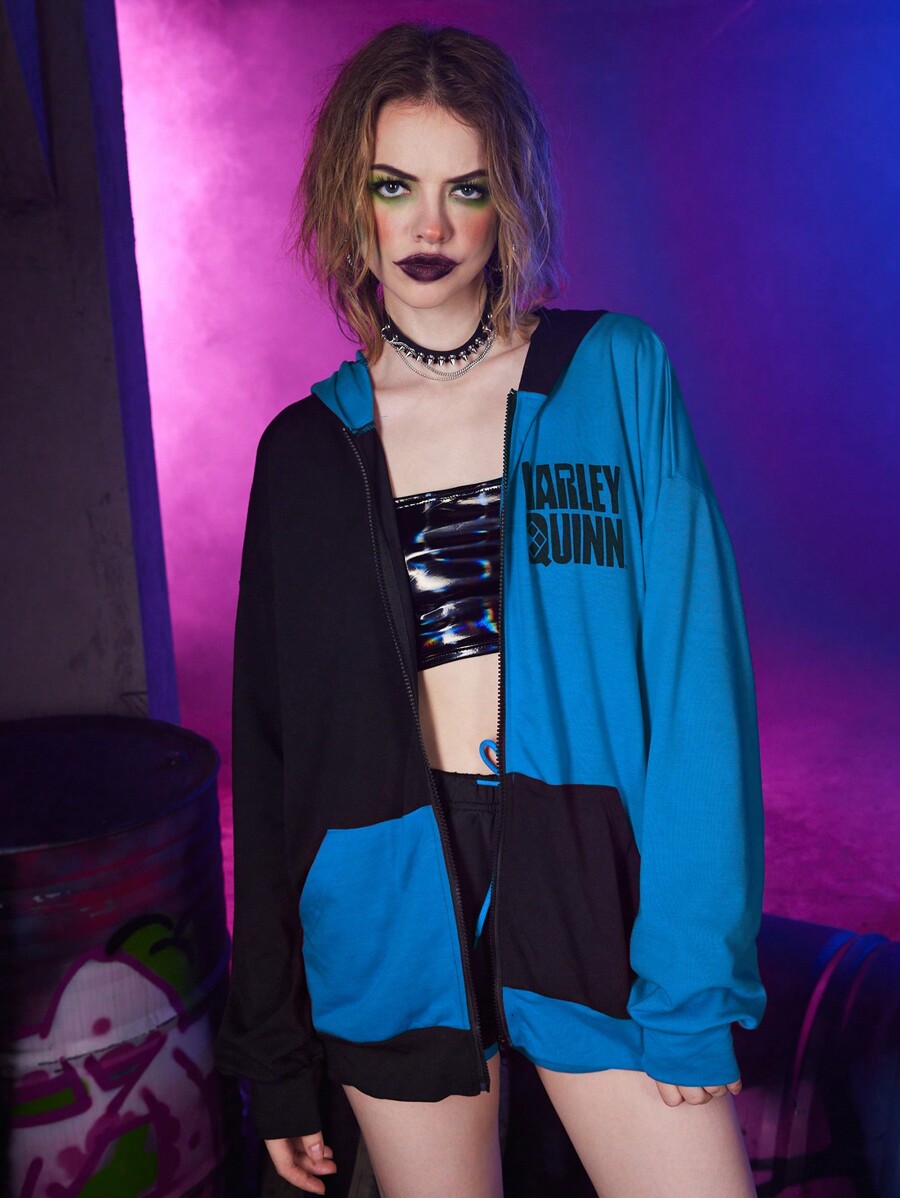 Harley Quinn | ROMWE Sweat-shirt à capuche oversize à fermeture éclair ouverte sur le devant, à patchwork de couleurs contrastées et asymétrique pour femmes