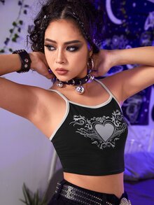 Goth Top à fines brides à imprimé cœur à liseré contrastant