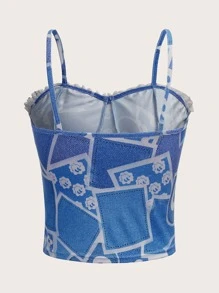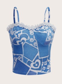 Top à fines brides cœur à imprimé sourire ourlet en dentelle