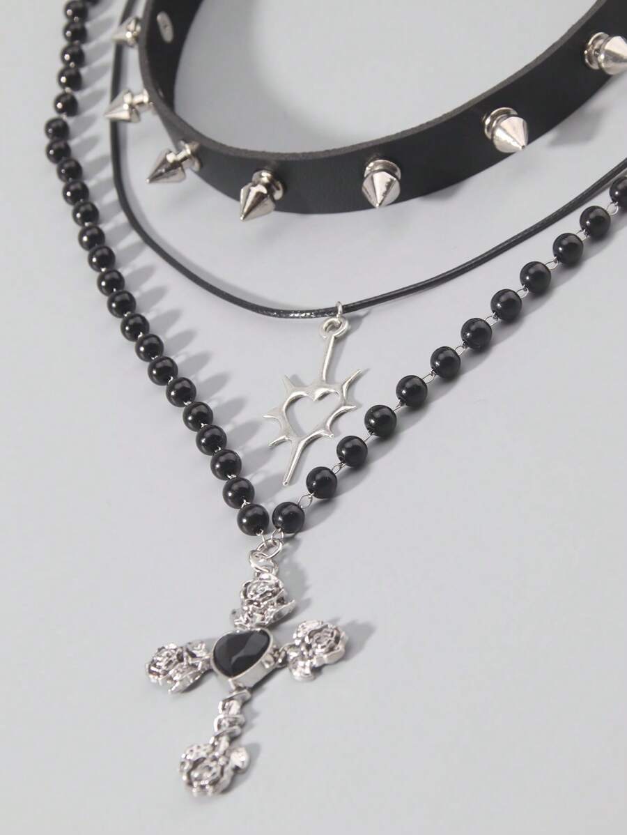 Hippie 2 pièces Collier long avec croix en faux perles et strass de style gothique, Ras-de-cou avec pointe, cœur et rivets, Chaîne pendentif punk hip hop, Pour les femmes, fête, cosplay