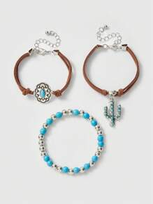 Hippie 3 pièces Ensemble de bracelets à perles de style occidental avec cactus et turquoise