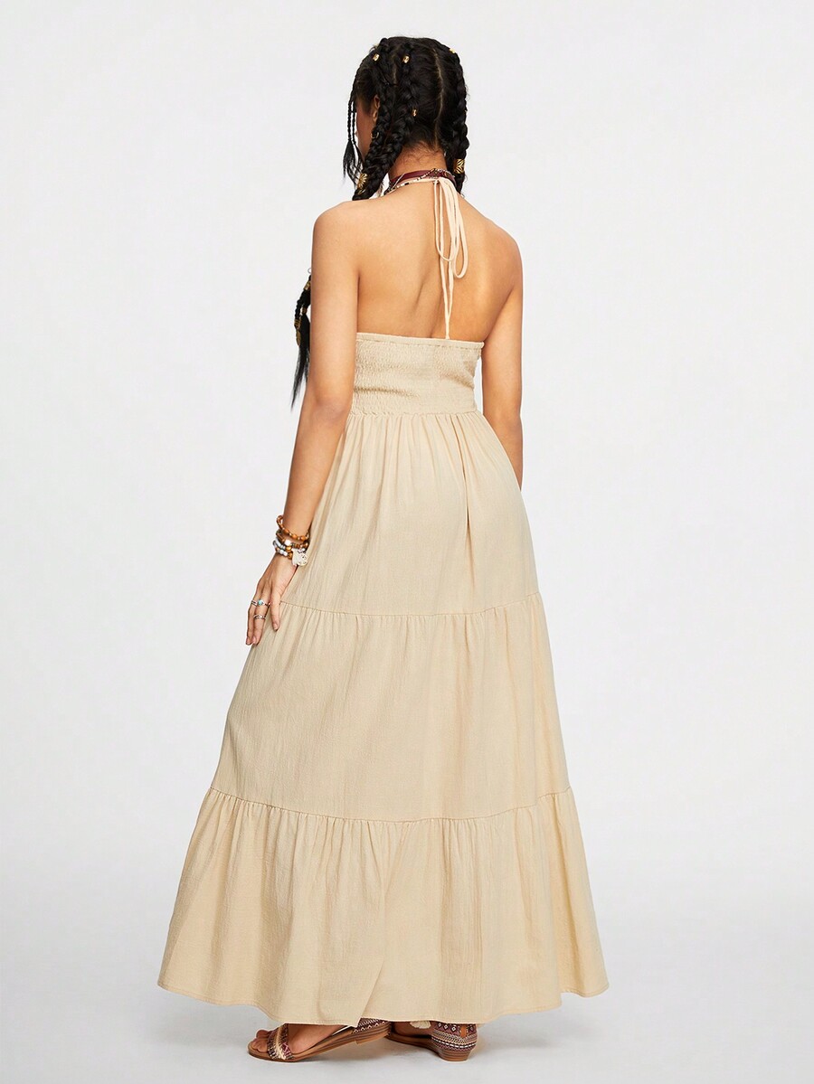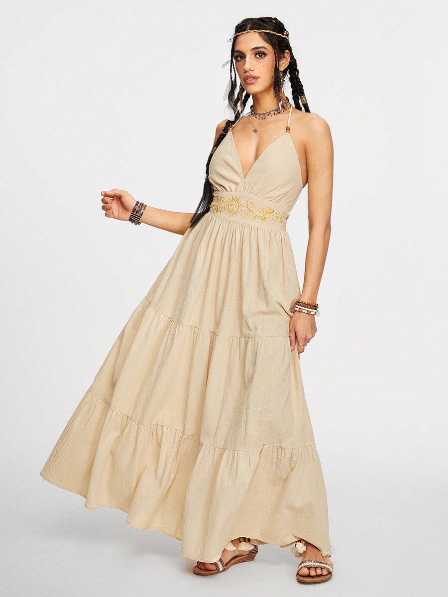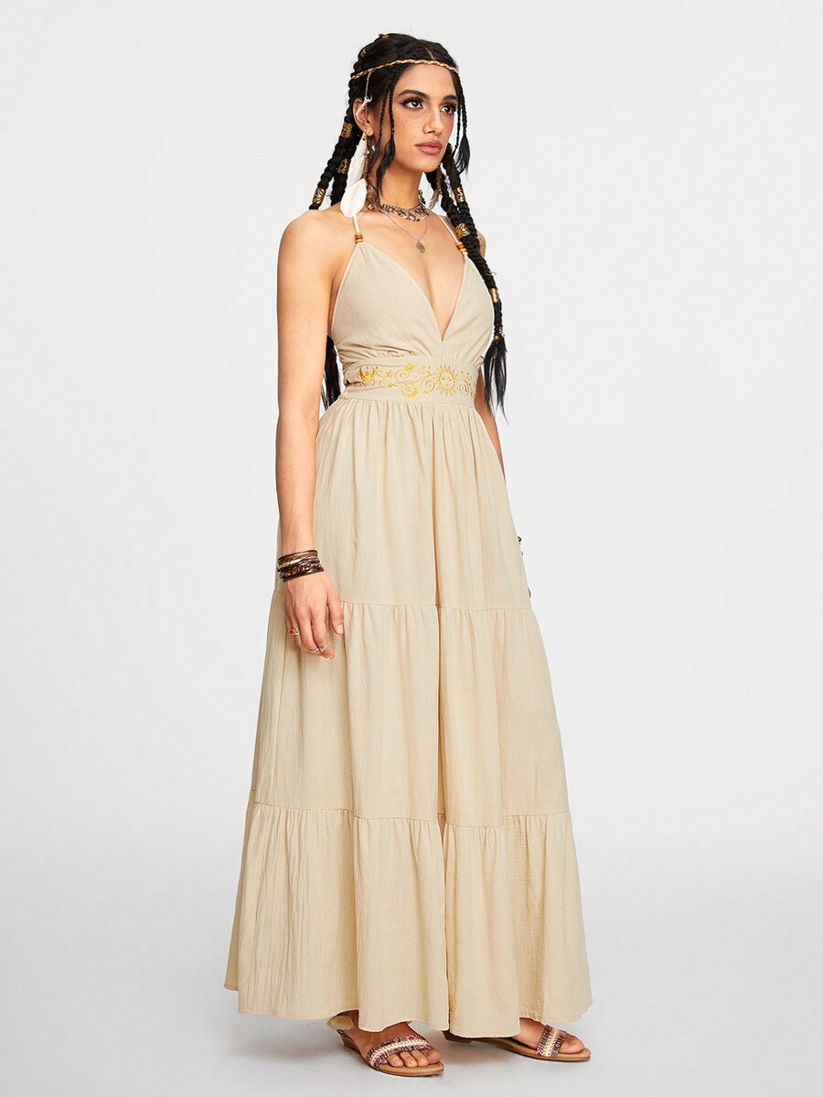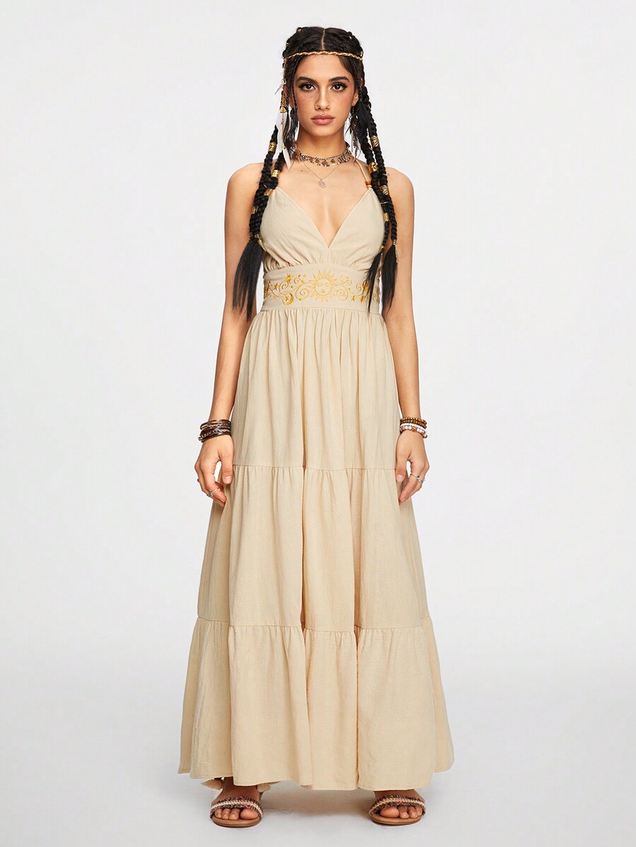 Hippie Robe d'été à bretelles femme style casual à ligne A avec broderie étoiles et lune