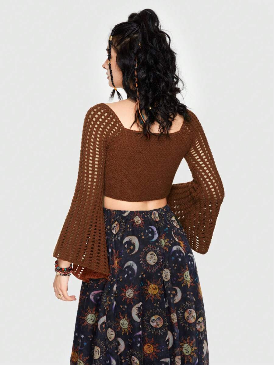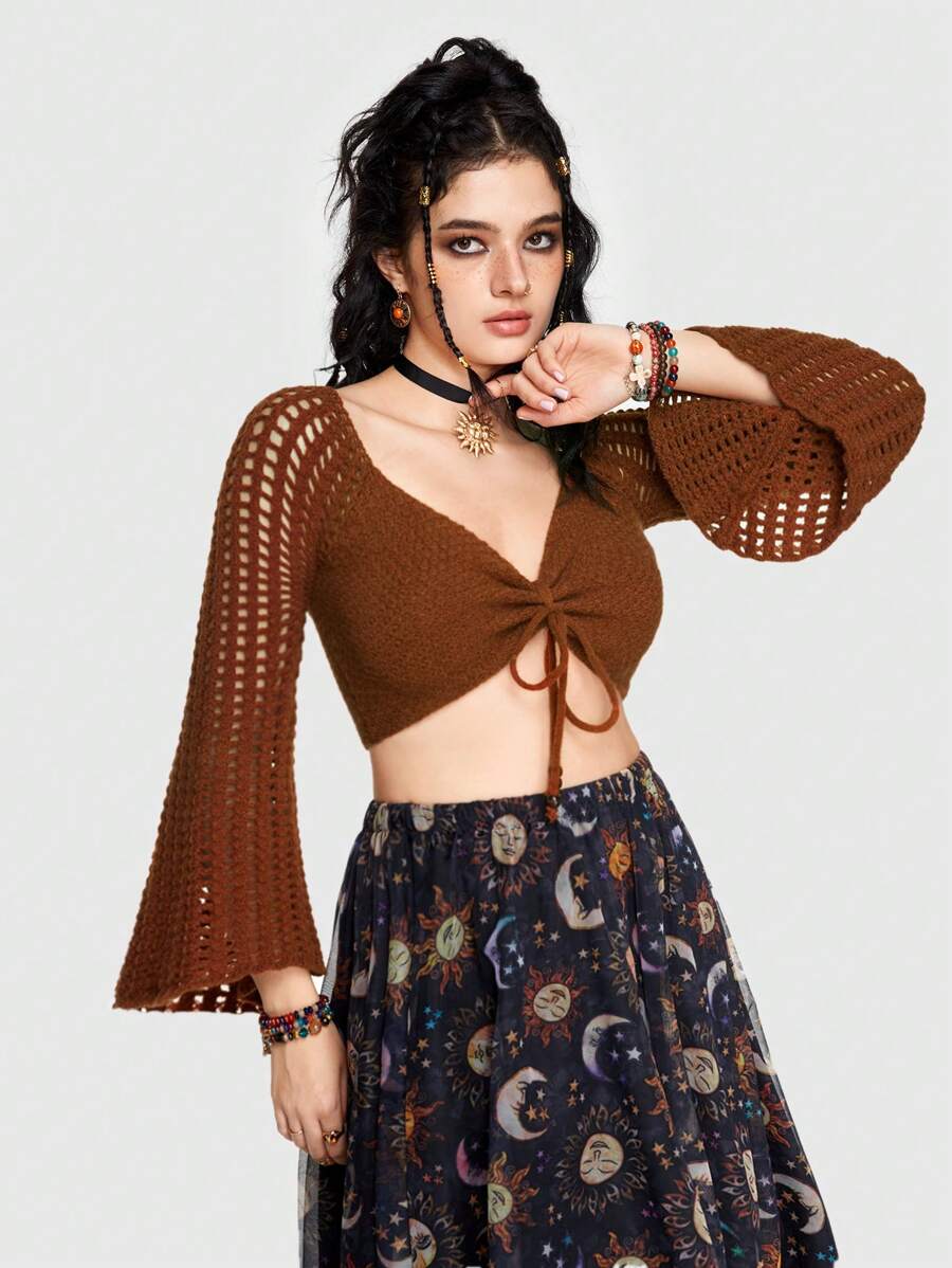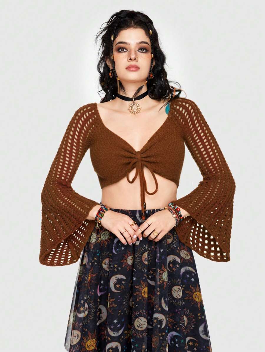 Hippie Gilet Tricoté À Œillets À Manches Évasées Et Nœud Sur Le Devant