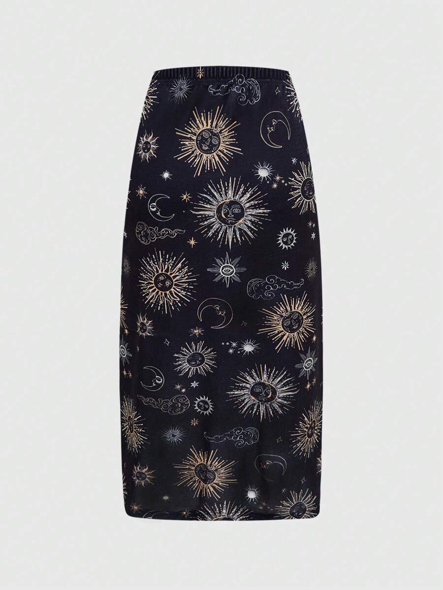 Jupe fendue brodée style hippie, soleil, lune et étoiles