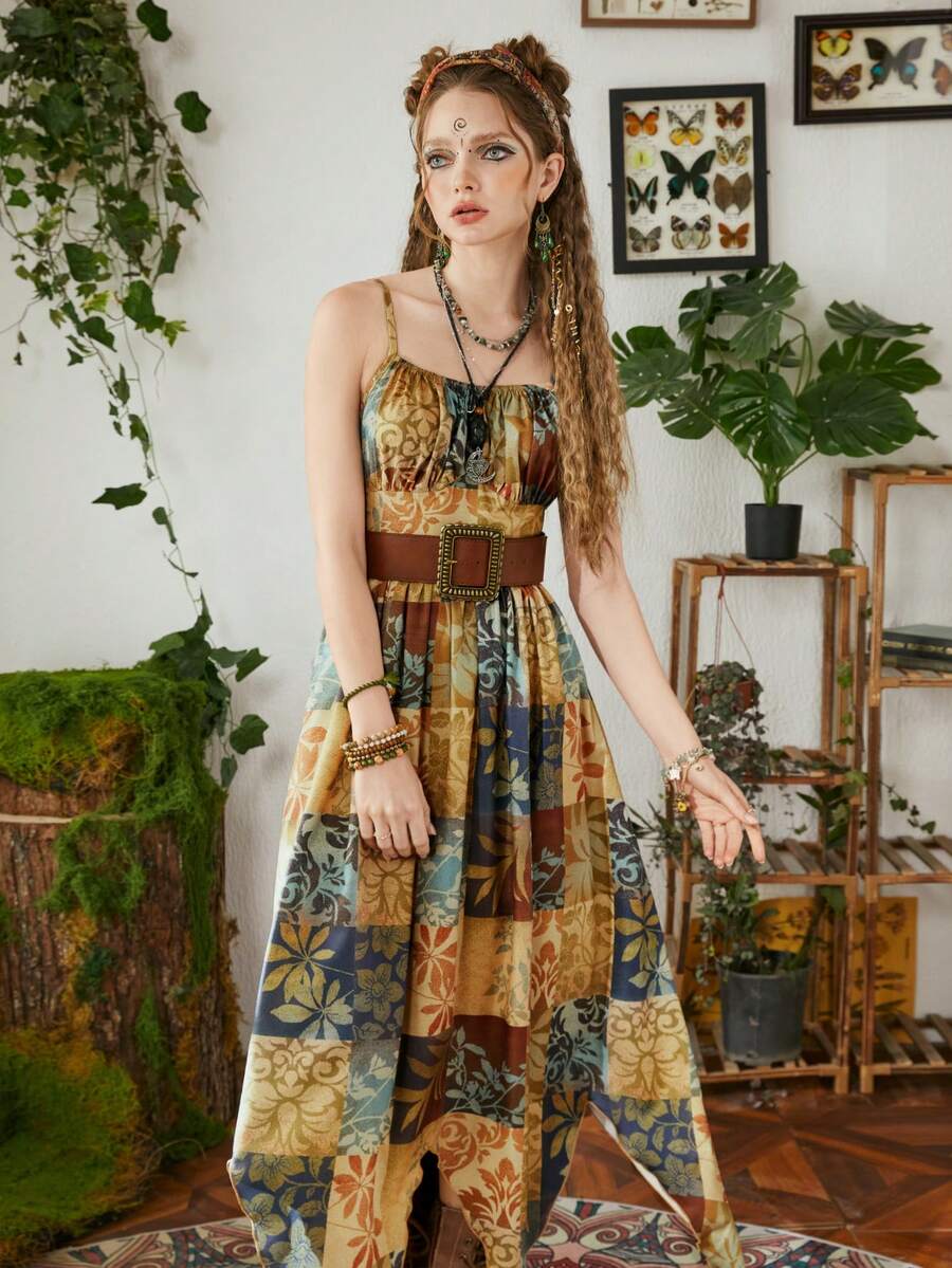 Hippie Robe À Fines Brides Imprimé Patchwork Froncé Ourlet Hanky