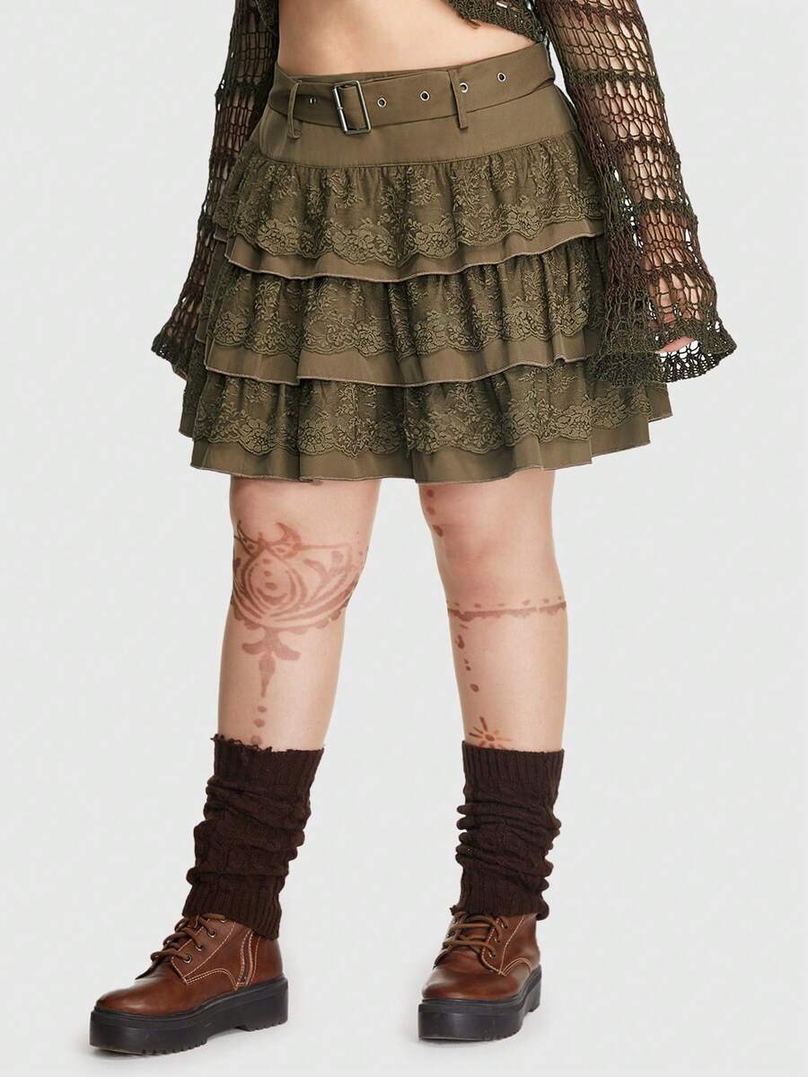 Hippie Plus Jupe En Dentelle Ourlet Superposé Avec Ceinture