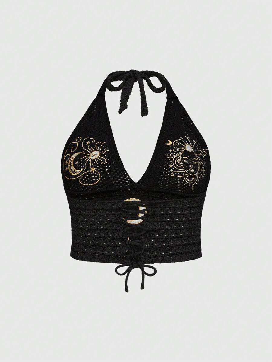 Hippie Top tricoté style bohème grande taille avec broderie soleil et lune, col montant