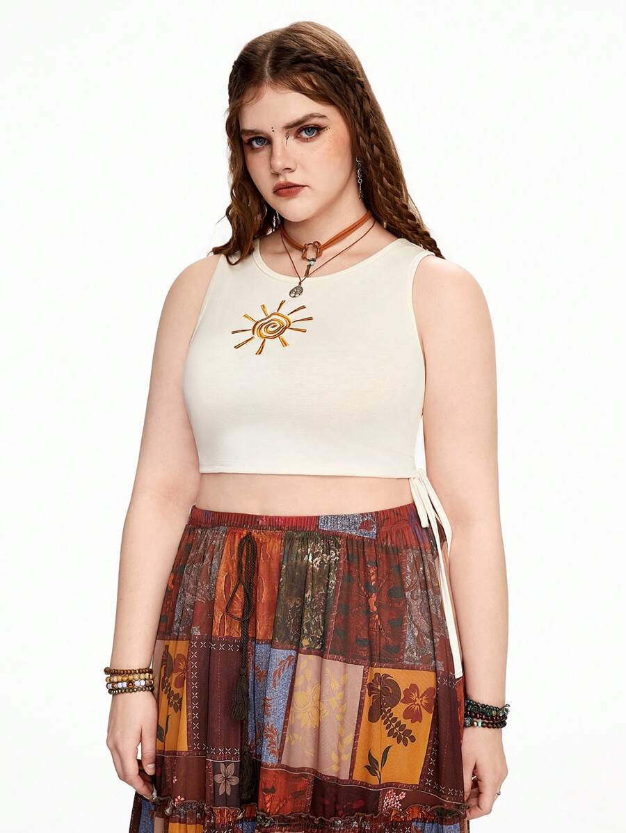 Hippie Débardeur à encolure ronde plissé à lien noué avec broderie en spirale de soleil en grande taille