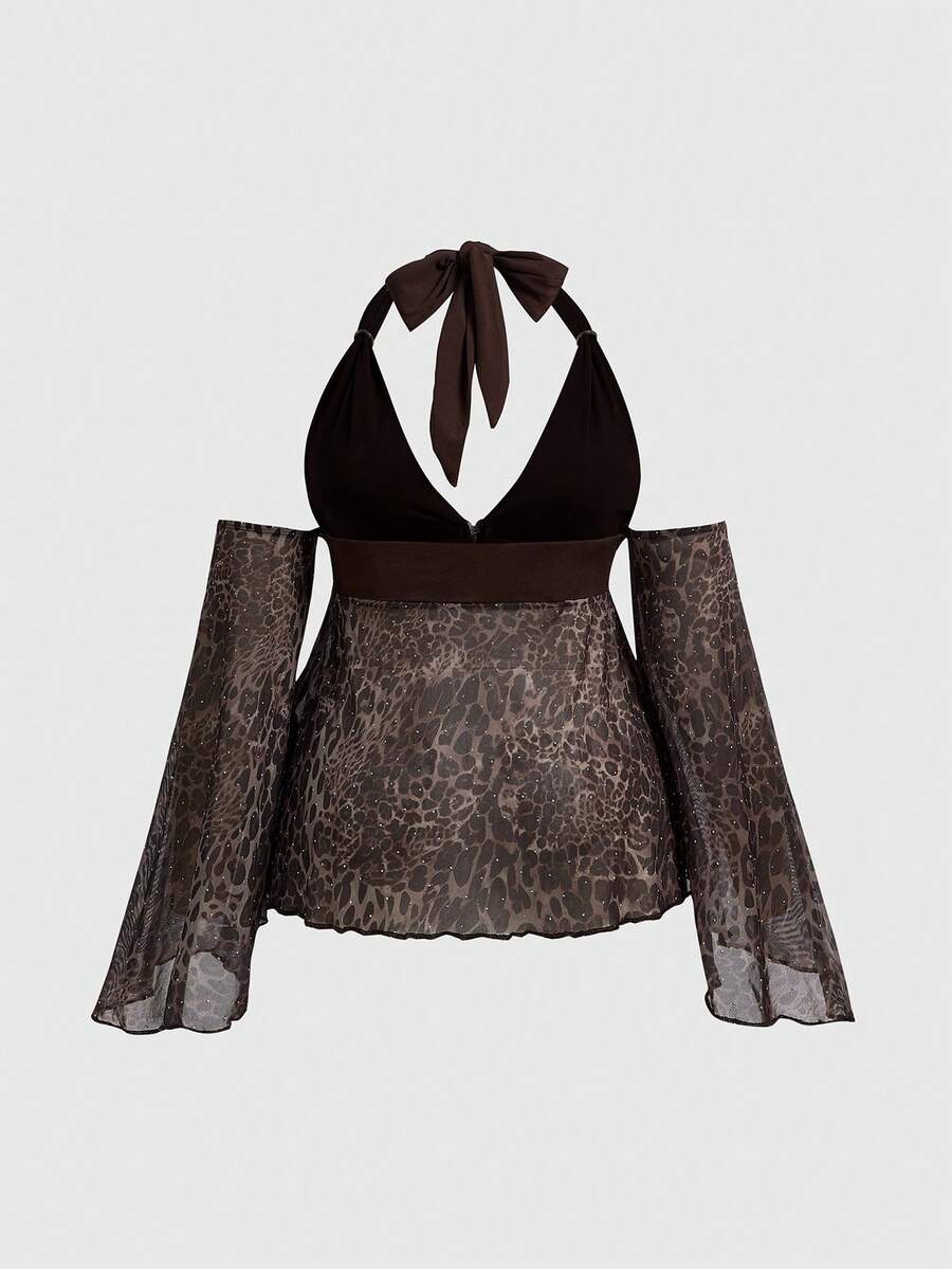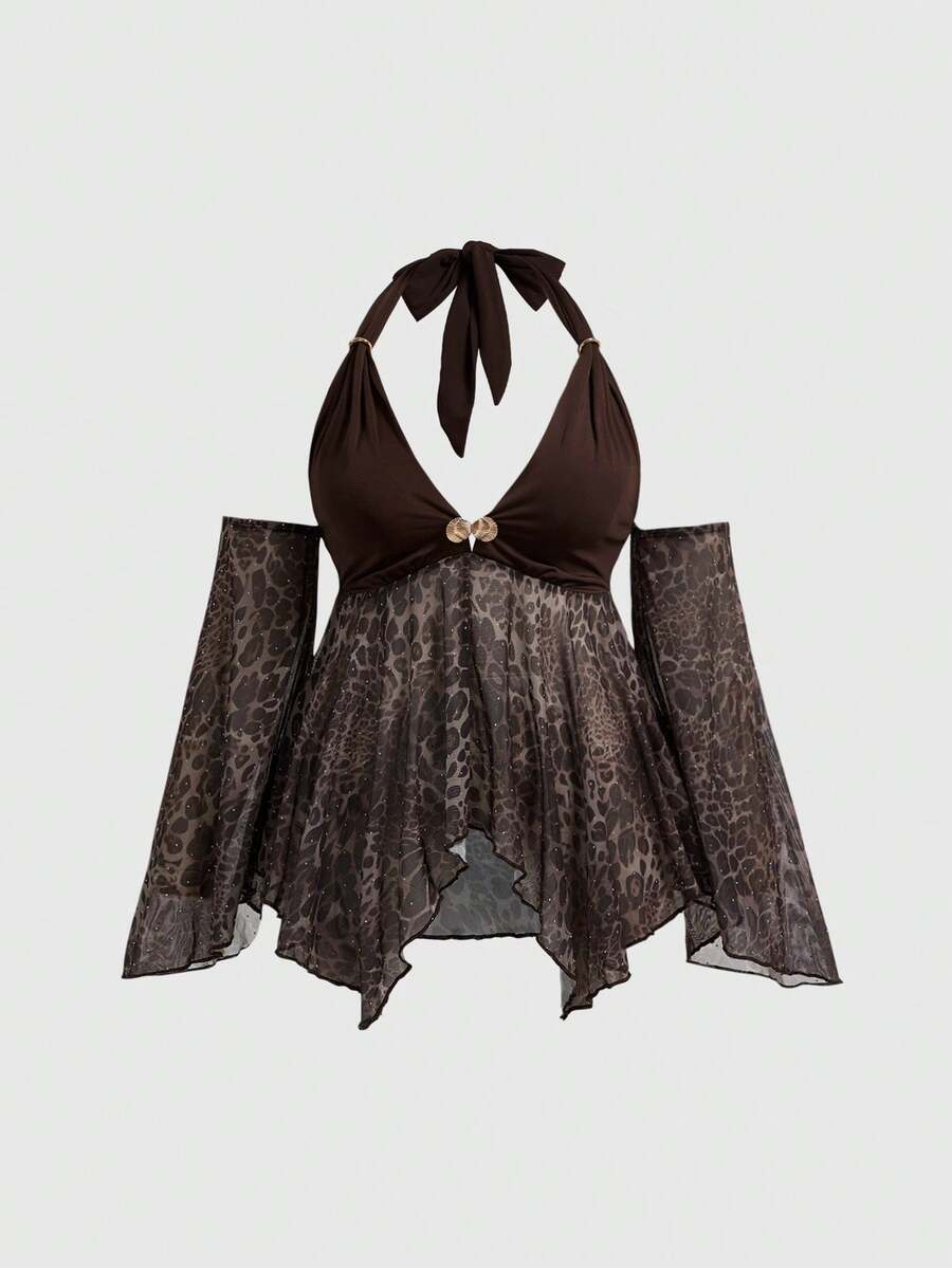 Hippie Femmes grande taille Top à manches évasées avec ourlet asymétrique, collier métallique à chaîne avec strass et imprimé léopard