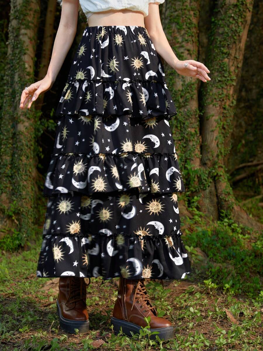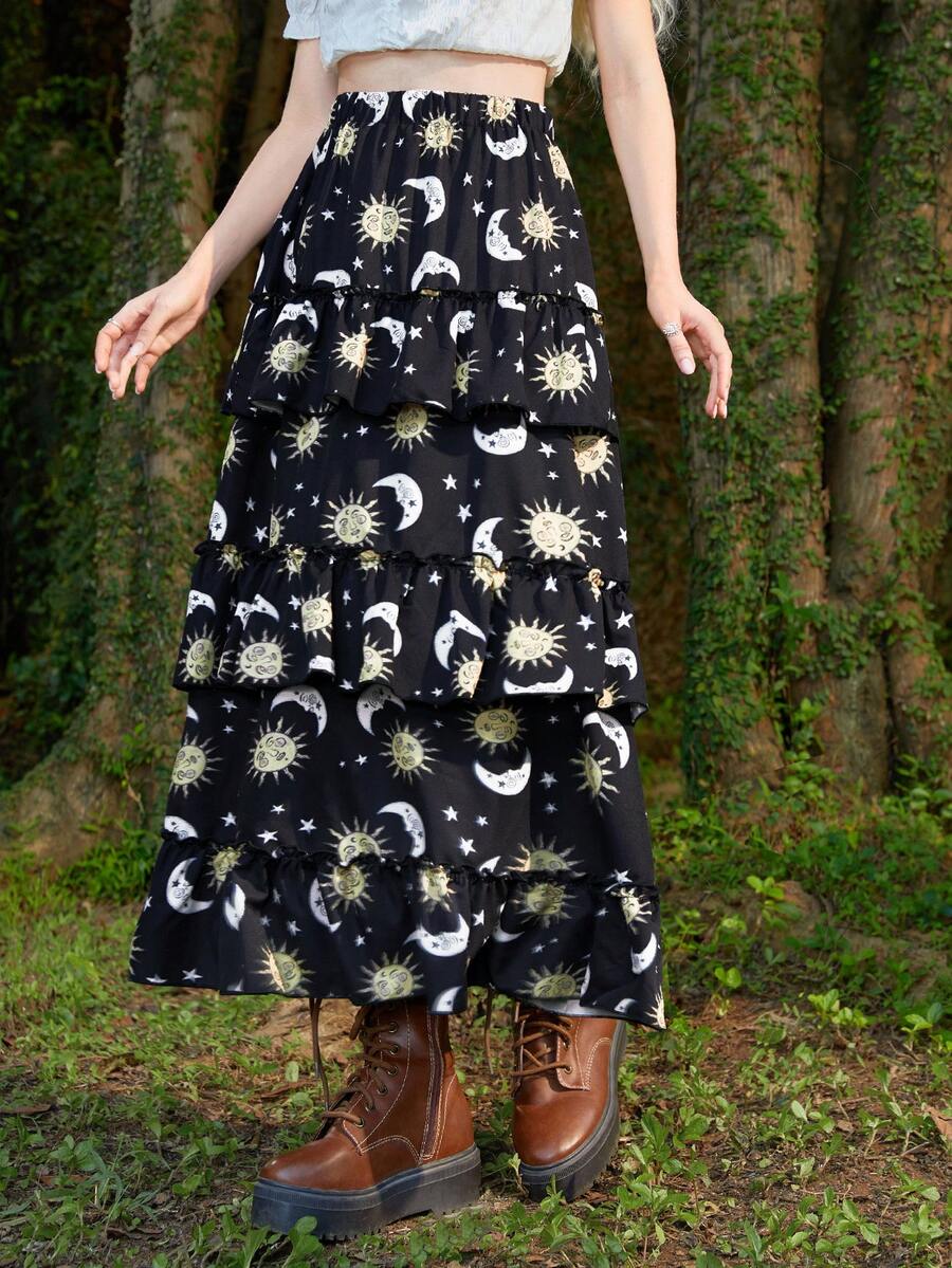Hippie Jupe Imprimé Soleil Et Lune À Volants