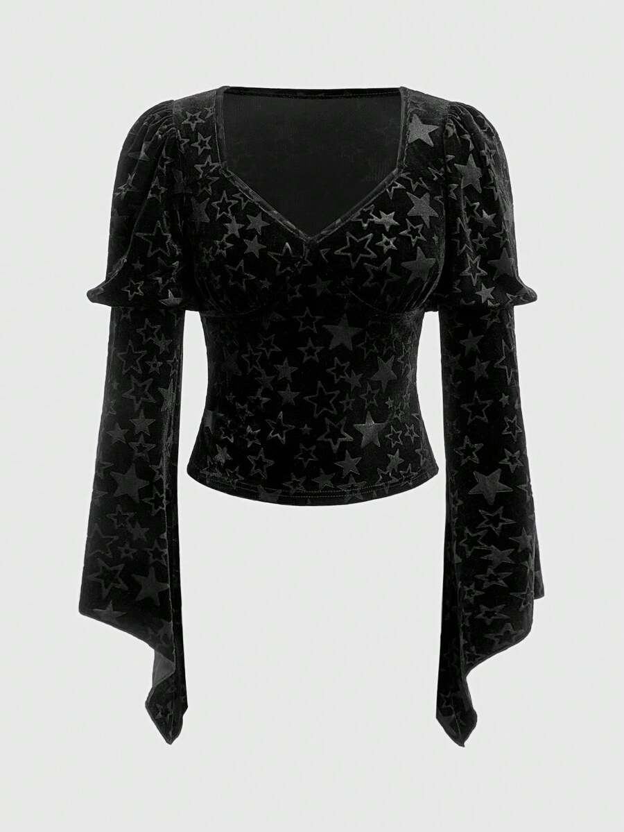 Hippie T-shirt En Velours Imprimé Étoile À Encolure De Cœur À Manche Évasée