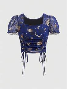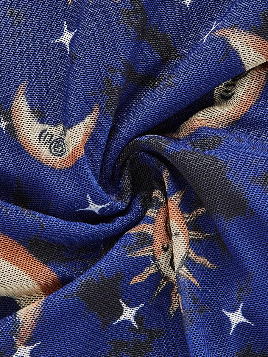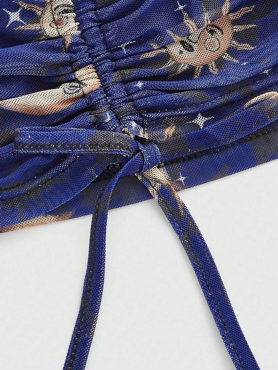 Hippie Haut Pour Femmes Imprimé Du Soleil, De La Lune Et Du Visage Avec Ourlet À Cordon De Serrage