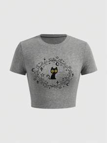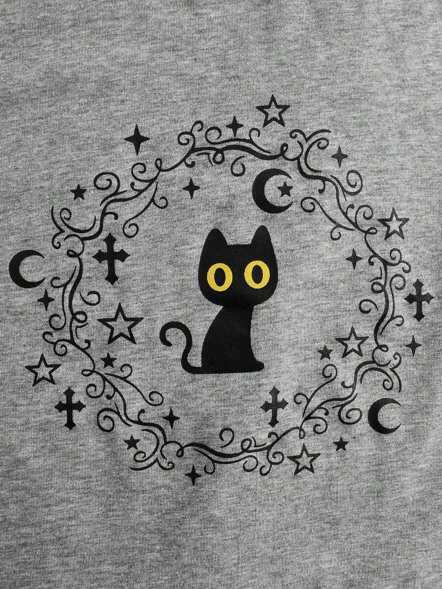 Hippie T-shirt À Manches Courtes Imprimé Mystérieux Avec Chat Noir Et Croix Pour Femmes