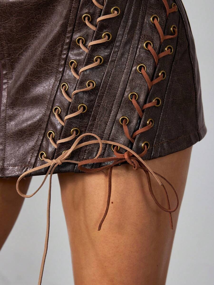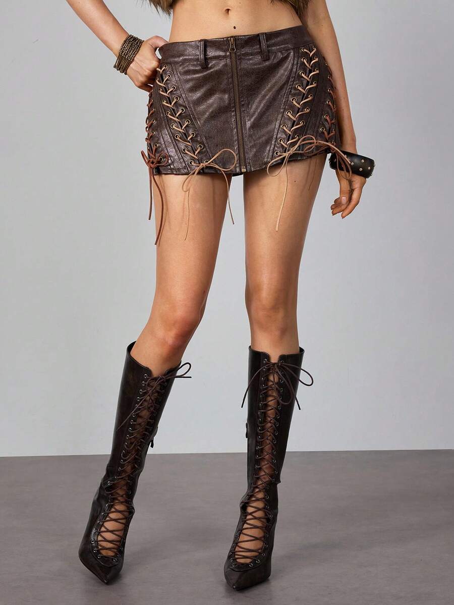 Hippie Jupe mini streetwear décontractée d'été pour femmes en PU avec laçage et fermeture éclair avant