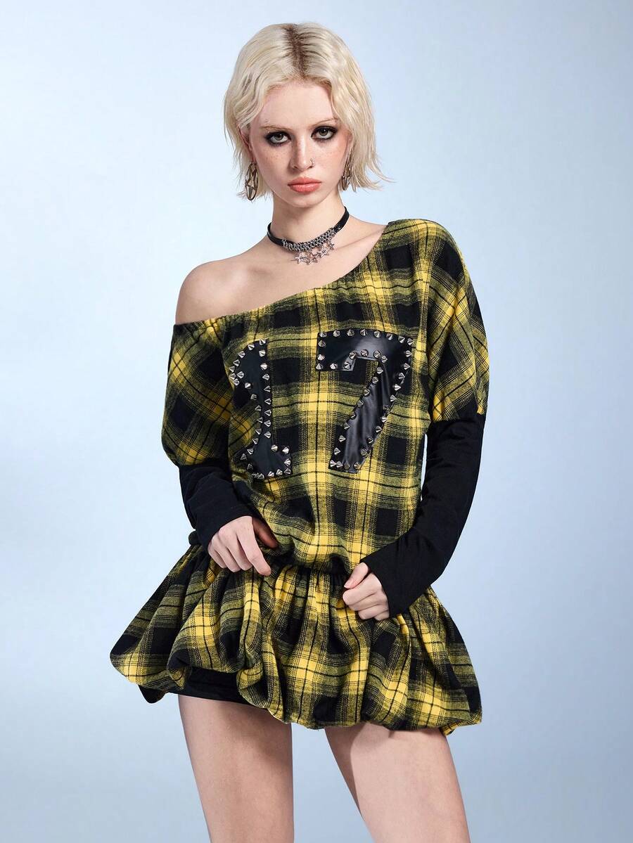 J-Fashion Robe mini à épaules dénudées avec rivets rétro sportifs et empiècement en faux pour femmes