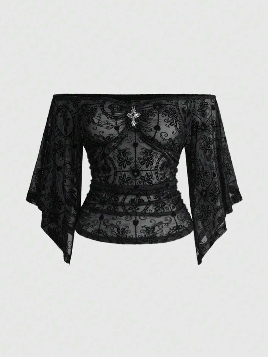 J-Fashion Top moulant à manches évasées et épaules dénudées en dentelle pour femmes