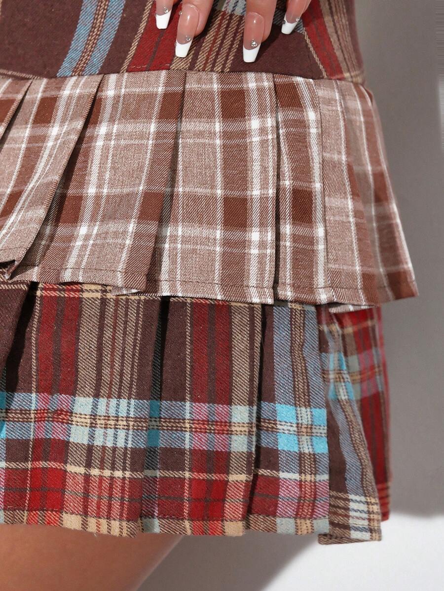 J-Fashion Jupe mini plissée à taille basse avec motif à carreaux contrastés, style universitaire rétro pour femmes