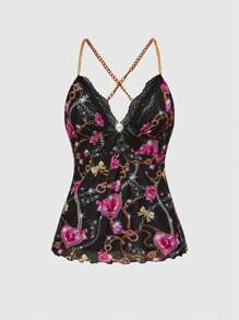 J-Fashion Débardeur court avec imprimé chaîne, robe poupée en patchwork de dentelle, style rétro Y2K subculture Shibuya Gyaru pour femme